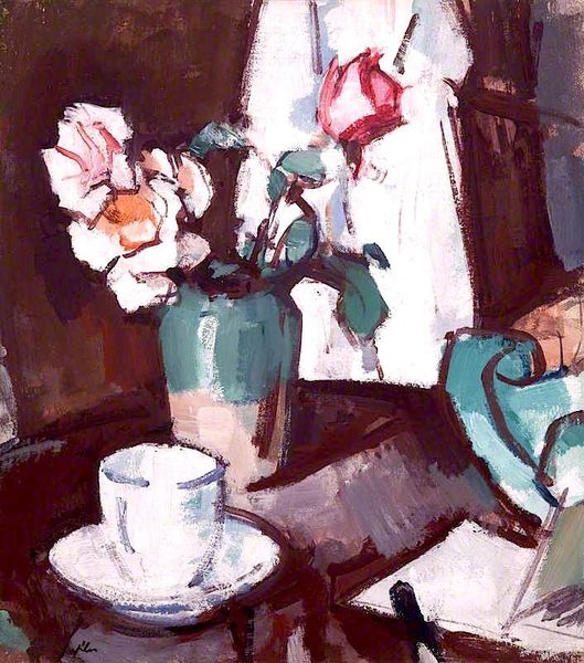 Editor: Samuel Peploe's "Still Life with Statuette and Books," painted in 1923, has a rather charming quality to it. The impasto technique really brings out the colours, making the everyday objects pop. What do you see in this piece? Curator: It’s interesting to consider the arrangement, isn’t it? What do books, a teacup, and a statuette signify when brought together? This selection hints at intellectual pursuits and domestic life coexisting. Perhaps Peploe is capturing a moment of quiet contemplation. Editor: The statuette feels quite classical juxtaposed against the boldness of the colors. Curator: Precisely! The contrast is key. The statuette symbolizes enduring tradition, while the vivid colors speak to modernism. It's the push and pull between the past and present, a common thread in art of this period, often mirroring broader societal tensions. What might the cup symbolize for you? Editor: I suppose the cup and books, more intimate everyday objects, balance the idealized form of the sculpture. It creates this really interesting, personal dialogue. Curator: I agree. The cultural memory embedded in the books alongside the domesticity of the cup suggests a learned individual finding solace and inspiration within the everyday. Perhaps Peploe himself. Editor: That makes sense. I hadn’t considered how the symbols accumulate like that. Curator: The emotional and psychological weight these objects carry become clear when viewing the still life, revealing a connection to something deeper. Editor: It’s almost as if the image is reflecting a complex inner world of Peploe’s life! Thank you! Curator: A fascinating way to reflect on Peploe and his engagement with both the visible and invisible worlds.