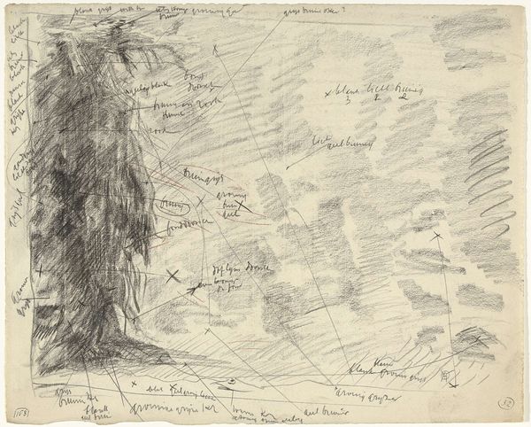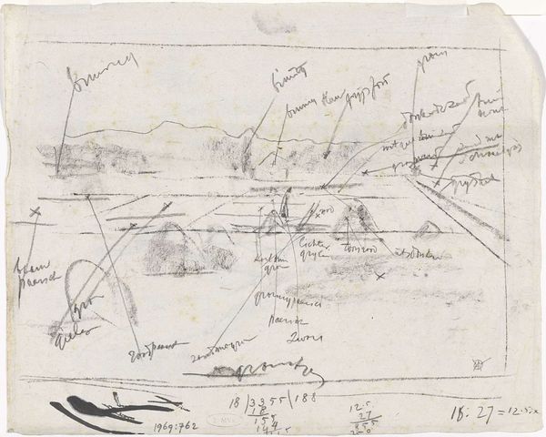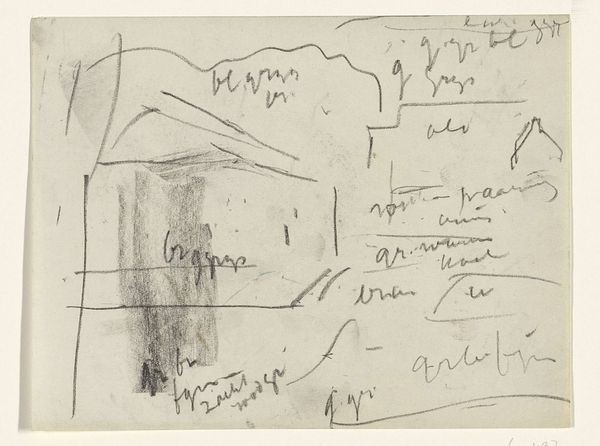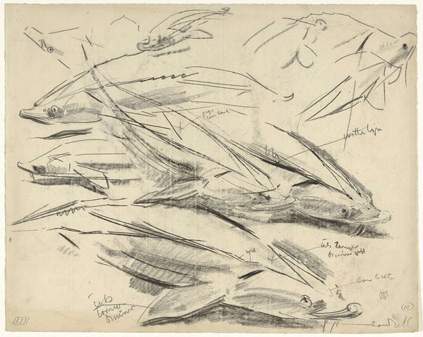 Curator: Welcome! We’re standing before Gerrit Willem Dijsselhof's work, “Ponen in een aquarium,” dating between 1876 and 1924, which currently resides in the Rijksmuseum collection. It’s a fascinating study executed with pencil and pen on paper. Editor: Immediately, I’m struck by its tentative nature. It feels like a fleeting moment captured. The tonal range is minimal, giving it a dreamlike, ephemeral quality. What do you make of it? Curator: The process is so evident. Dijsselhof allows us a peek into his artistic labor. The visible underdrawing, the scribbled notes around the central figure; these give clues into his artistic considerations. How does that affect your reading? Editor: It shifts my perspective slightly. Knowing this isn't meant as a finished piece, but rather a step in the artistic production changes how I approach the form. Notice the way he builds up the mass of the prawn through repeated strokes. This emphasis makes its translucent quality more apparent. Curator: Precisely! And consider the social context. Aquariums were a fashionable curiosity. Dijsselhof seems interested in the mass production of the prawns. Were they destined to become dinner, or decoration? The making of art also meant the extraction and marketing of real objects and living creatures! Editor: Perhaps a bit of both. Regardless, his attention to its form brings me to appreciate the structure of this small yet curious living object. Do you think Dijsselhof chose this subject for its abstract properties? Curator: No doubt he saw the artistic potential in reflecting nature, but more to the point for Dijsselhof and his era: what would his patrons pay for? Editor: The beauty of this prawn lies within the eye of the beholder. Dijsselhof masterfully created a study of contrasts – light and shadow. Thank you! Curator: Thank you! Understanding the circumstances can also change how you behold Dijsselhof's little prawn, a peek at the production of artistic form and the social world!