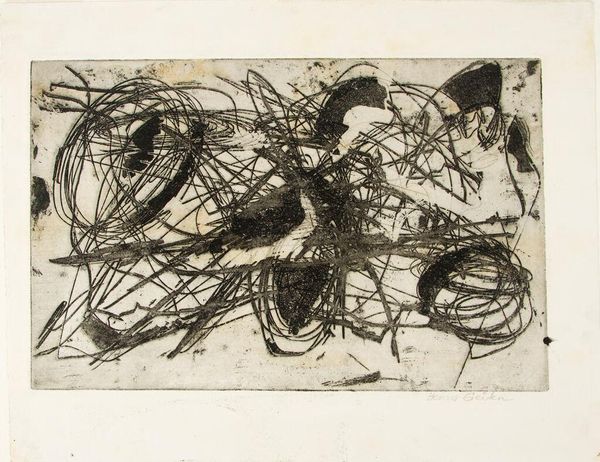 Curator: Before us is Roy Lichtenstein's "Untitled (Illustration for "Polemic" Magazine)" from 1957. It's a black ink drawing and print. Editor: It’s a chaotic yet contained composition. The density of the black lines gives it an almost oppressive weight, a stark contrast on the off-white paper. Curator: The interplay of these looping lines generates a rather curious dynamism, wouldn't you agree? The intersecting forms create pockets of positive and negative space. This use of pure line emphasizes the two-dimensionality of the work. The contrast heightens this effect even further. Editor: Absolutely, but I'm also drawn to what this kind of frantic linework signifies in the broader context. Given its creation for "Polemic" magazine, how might Lichtenstein’s method mirror the heated, urgent dialogues of the time? This is about immediacy; a low-cost means to propagate an idea. Ink on paper to disseminate thought. Curator: That’s certainly one way to read it – situating its form relative to the printing process of accessible journals, reflecting those parameters. Perhaps its style—though abstract—is meant to visualize ideological debates, rendered by the linear qualities and material accessibility, as well. Editor: It seems more than a formal exercise; it’s a tangible manifestation of artistic labor for rapid consumption. It's less about some artful, elevated design, and more a means for urgent public intervention via this readily available printed matter. It mirrors society’s engagement with ideas, quick, iterative. Curator: Very interesting interpretation. Though Lichtenstein is known for his engagement with mass production, I had never considered this piece’s formal aspects from such a socio-economic standpoint. Editor: I suppose seeing the artwork within the frame of material means offers another way to grasp its context. I believe it enriches our understanding beyond a mere reading of signs. Curator: Agreed. Materially considered and philosophically digested, this piece truly gives us quite a bit to consider about both process and formal strategy.