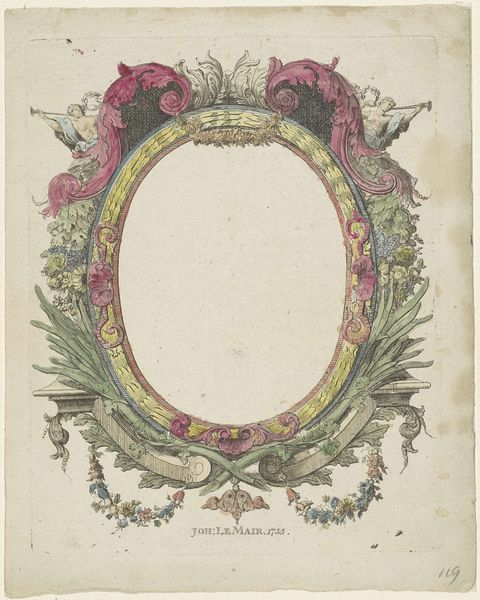 Curator: Right, let's spend a moment with this fascinating print, "Twee ovale omlijstingen," or "Two Oval Frames," created around 1768 by P.J. Bertren. You'll find it here at the Rijksmuseum. Editor: My immediate thought is delicate ornamentation! A gentle baroque flourish frozen on the page. There’s almost a breathy quality to the engraved lines. Curator: Indeed! Bertren meticulously crafted these designs as potential frames for jewels and portraits. He employed drawing and engraving on paper to showcase two oval frame variations. The upper one is adorned with ribbons and what appears to be foliage, and at the very bottom you’ll notice some intricate initials at the bottom of the frame. The lower frame echoes this, but includes delicate florals. Editor: Thinking about the materials… Paper, ink, the tools used to etch those lines—there's a whole world of craft implied in these designs. What social context gave rise to these decorative frames? Curator: Absolutely! These were not just idle doodles. They reflect a society that relished detail, the burgeoning jewelry and portrait industries, and the growing accessibility of these goods. Think about the craftsman, hunched over their worktable, painstakingly carving these fine lines… Editor: I am thinking of what could be placed within, something to enshrine... It is not only ornamental but it almost gives it sacredness. Curator: The baroque flair also communicates power and elegance, right? This frame elevates its contents to something more important than what it is holding… Do you imagine these ended up encasing grand family portraits, or precious stones destined for royalty? Editor: Or perhaps, humble keepsakes imbued with great personal value! Maybe it was made not only to be admired but also used… There are always alternatives if you move away from only royalty! Curator: That’s the beauty, isn’t it? These frames, these vessels of potential, are able to mean so much. They give people like us a portal to all possibilities of imagination. Editor: Ultimately, Bertren’s engravings point us towards understanding artistry as both process and purpose.