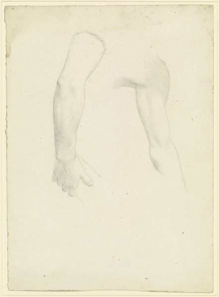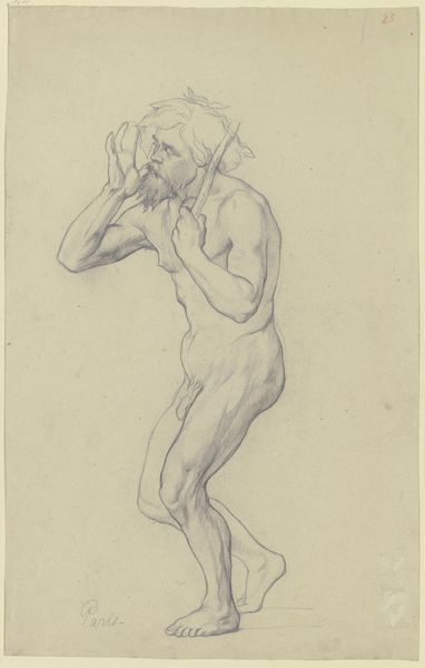 This is a pencil drawing of a standing male nude with his upper body bent forward, left arm raised, by Victor Müller. Although undated, it was likely made in France in the mid-19th century, perhaps during the artist's time in Paris. Müller was associated with the Realist movement, which challenged academic conventions. The image resonates with the period's fascination with the human body, made popular by the institutionalization of anatomy in the academy. Male nudes were traditionally employed in art education to teach students about the ideal form, which has its roots in ancient Greek and Roman art. This piece can be seen as an academic exercise or a study for a larger painting. To gain a deeper understanding, we can consult the archives of art academies. Knowing more about the curriculum of these institutions can clarify the role of Müller's artistic practice in the broader context of 19th-century French art.