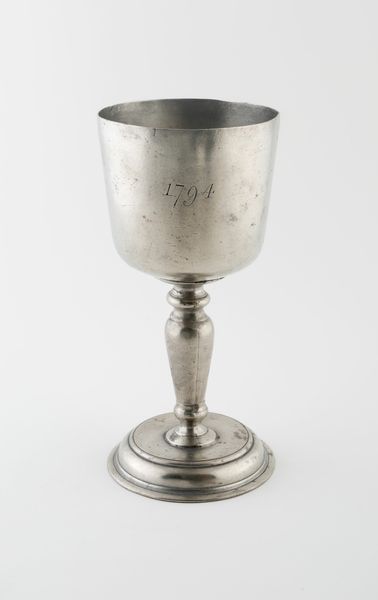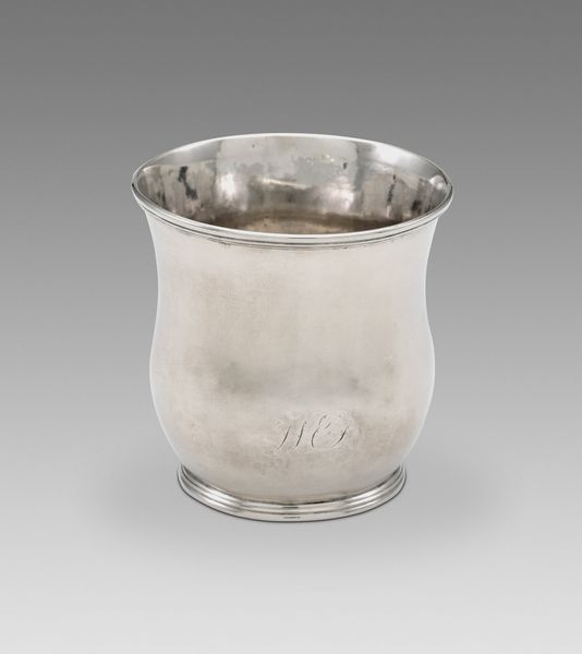 Curator: Welcome. Before us is a silver wine cup, dating to around 1660. It's currently part of the Art Institute of Chicago's collection and is attributed to John Hull. Editor: It’s deceptively simple at first glance, almost severe. That stark, unadorned silver makes me think of puritanical austerity. Curator: Note the form, though. The distinct components, the bulbous knop, and the wide, stable base are decidedly baroque, no? Consider the construction—how Hull skillfully joined these sections. There’s a tangible rhythm in the arrangement. Editor: Rhythm, yes, but it also speaks to a specific moment. Think about 1660. The English Restoration. This cup wasn’t just a drinking vessel; it was a signifier. The return of Charles II brought with it a rejection of Puritan values and a return to conspicuous consumption. The burgeoning wealth of merchants fuelled the need for these refined pieces. Curator: The engraving, too, offers a different type of reading. That inscription – 'I William Needham to Brandy' suggests a personal narrative. The graceful curves and swirls of the script stand in contrast to the goblet's sleek exterior. Editor: Indeed. Who were William Needham and Brandy? A lord offering a gift to his favored steed, a father bequeathing this chalice to his son, or a declaration of ownership? The inscription opens many questions that speak to patriarchal societal structure and economic exchange. How do we understand wealth accumulation, especially that passed through inheritance or gender roles? Curator: Perhaps. Still, I remain fixated by the way light interacts with the metal's surface, the cool luminescence radiating. Editor: Which returns us, paradoxically, to considering it simply as an object, when so much else informs its creation and reception. Curator: A beautiful and revealing paradox indeed, wouldn’t you say? Editor: Absolutely; it urges one to think.