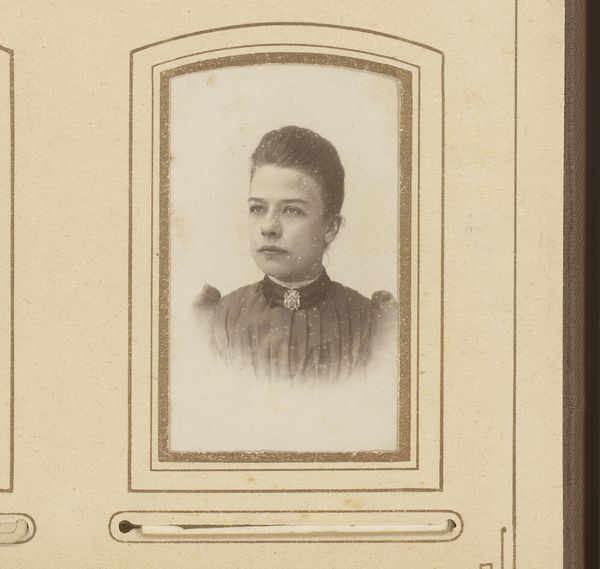 This is a small photographic portrait of a woman, made by Pieter Duiker, who was active in the Netherlands between the late 19th and early 20th centuries. The photo's size and the woman's attire point to the conventions of bourgeois portraiture from that time. This was a period when photography studios blossomed, offering an affordable way for middle-class families to immortalize their loved ones. But beyond personal mementos, these images played a broader social role. They reinforced ideals of respectability, domesticity, and social status. The woman’s simple yet dignified pose and clothing, coupled with the formal framing, speak to these values. Consider the explosion of photography at this time, and the institutional role of studios in shaping a new visual culture. It’s through accessing archives, studying studio practices, and engaging with period literature that we can fully grasp the complex relationship between art, society, and historical context.