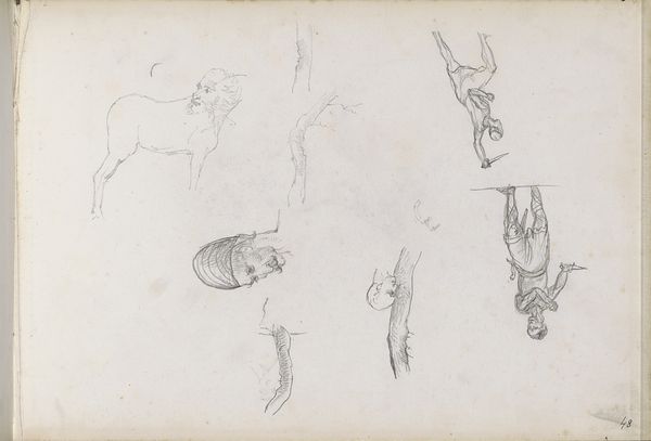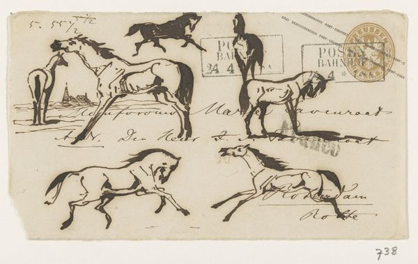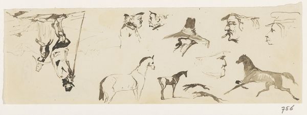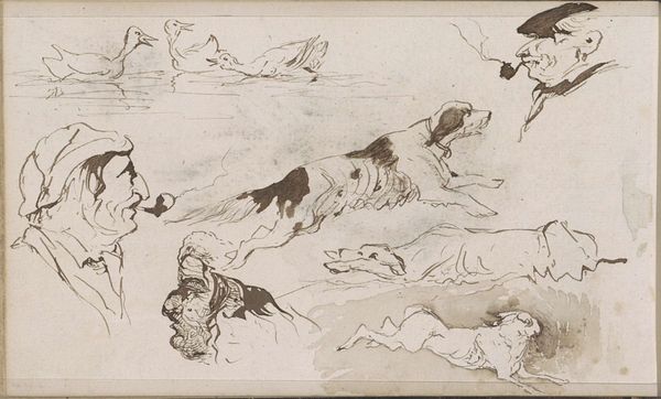 Curator: Looking at this page of studies, “Schetsen van jachthonden” as it's known, created by Johannes Tavenraat sometime between 1840 and 1870, now housed in the Rijksmuseum… what leaps out at you? Editor: The immediacy of it. It’s all swift lines and captured movement, an energy contained on a single sheet of paper. And it feels…masculine, somehow. Curator: Interesting. The image teems with iconographic significance. Notice the prominent rendering of the hunting dogs, archetypal symbols of loyalty, but here also agents in a very class-defined pastime. There's the rabbit, a more ancient symbol, linked to fertility, new beginnings... and, of course, vulnerability. Editor: Yes, and considering this drawing was made using pen and brown ink over graphite, those quickly laid marks speak volumes. Tavenraat isn’t after a polished final product. This is about process—experimenting with form, seeing how the pen interacts with the paper, finding the essential lines needed to convey a chase. Curator: And consider the function of genre-painting itself in that era, typically portraying scenes of everyday life and often idealized visions of pastoral settings… hunting held an odd intersection as a leisure activity involving all classes. Editor: These studies would likely inform a larger, more refined work, yet they hold an appeal precisely because of their roughness. We witness the artist thinking, the raw physicality of making something – not unlike craftwork of the time which employed natural products, by hand. There is evidence of social hierarchy when labor and privilege intertwine in such leisurely activity, and even these sketches become collectible commodities. Curator: You mention process…and it gives rise to multiple narratives around symbols. Does the quick, efficient rendering suggest the normalization of hunting as sport? Or the hare seeming so still - might its position imply a warning to the working man who has just as much of a possibility to rise as a predator? Or even succumb to one. The iconography has so much cultural meaning at play. Editor: It’s all quite compelling – the economic engine underlying even a sketch like this is much more evident than perhaps the casual viewer might recognize. It reveals the means through which power manifests. Curator: A fruitful reflection, certainly adding deeper resonance when interpreting "Schetsen van jachtonden.” Editor: Indeed. It makes one consider that what we perceive and receive involves more than just images or subjects, but the means to producing, reproducing, and assigning values and meaning to them.