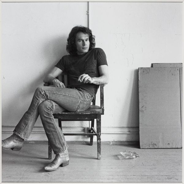Editor: This is Robert Mapplethorpe’s photograph of Brice Marden. It’s striking how Marden’s paint-splattered clothing mirrors the gestures in the painting behind him. What can you tell me about this work? Curator: Note the materiality of Mapplethorpe's work. The photo itself is an object produced through a specific process. How does the image, as a commodity, relate to the art world Marden inhabits? Editor: So, you’re thinking about how the photograph itself becomes part of that artistic exchange? Curator: Precisely. It's about the labor of creation, the exchange of artistic capital, and the eventual consumption of these objects. Food for thought, eh? Editor: That does give me a lot to consider about the art world and this photo. Thank you!