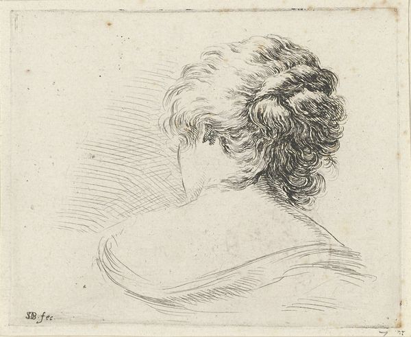 Curator: Here we have "Head of a Woman Seen From the Back, Facing Left," attributed to Stefano della Bella, dating from 1620 to 1664. It’s currently held here at the Rijksmuseum. The piece employs both ink and pencil in a delicate drawing. Editor: My first thought? Quiet grace. It’s subtle but arresting—that profile against the open space, the delicate lines giving texture to her hair… Makes you wonder what she's thinking about. Curator: The structure is undeniably Baroque. Notice the interplay of light and shadow rendered through the delicate cross-hatching? Bella masterfully uses line weight to suggest volume, lending depth to a figure seen primarily in profile. Editor: It's more than just volume. The texture of the hair, almost chaotic in its arrangement, gives the work a liveliness, an energy. There's a hint of the divine too – her hair seems almost haloed. Curator: Precisely. Though the style adheres to academic art traditions, there’s a dynamism that transcends mere representation. Look closely at how the lines flow, almost a current moving across the page, directing our eye and reinforcing the composition’s inherent symmetry. The formal qualities support and reinforce the subject’s classicism. Editor: The empty space matters so much! It makes me think of unfinished poems or melodies that hang in the air... leaving us, as viewers, with some sense of her dreams just beyond our grasp. This image stays with you. Curator: I agree. It’s a deceptively simple composition, one that encourages multiple readings. Its aesthetic force originates in its effective deployment of a restrained visual language and subtle contrast of light and shade, characteristic of this period. Editor: You know, stepping back from the theory and art history for a sec, it feels incredibly modern. This drawing invites us into her solitude, sharing the universal moment. Makes you wonder who she was and who she might be. Curator: Indeed, a lasting observation, demonstrating how carefully studied and balanced composition gives “Head of a Woman Seen From the Back, Facing Left” a transcendent aesthetic significance and sustained appeal, despite the centuries which have elapsed since it was drafted. Editor: Absolutely. From fleeting first impression, it slowly unfurls, creating something almost everlasting, and reminding you of why this piece continues to resonate within these museum walls.