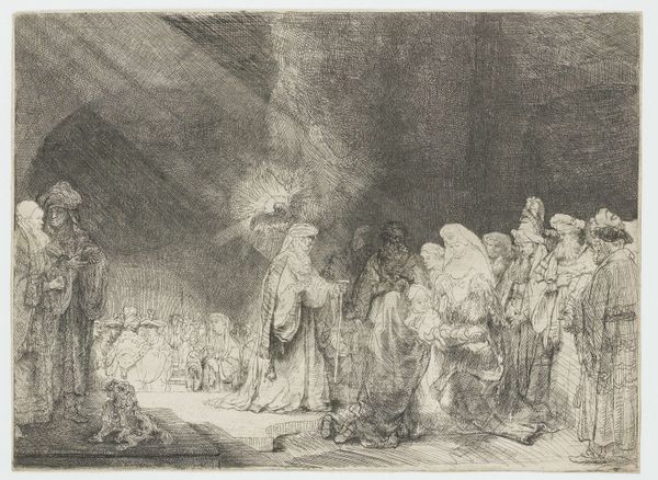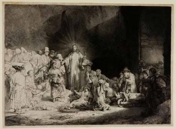 Curator: Good morning. Let's consider Rembrandt van Rijn’s etching "The Three Crosses," created in 1653. It resides here in the Rijksmuseum. Editor: Striking, isn't it? At first glance, it's a storm of dark and light. So dramatic, so theatrical… feels like peering into the heart of grief itself. Curator: Exactly. And that darkness is no accident. The richness and texture comes from Rembrandt’s masterful use of drypoint, which allowed for deep burrs of ink to cling to the plate, creating intense blacks when printed. Think of the labor involved! Repeated passes, pushing that burin across the copper. Editor: Makes you think about the cost, the physicality, the sheer grit of the process mirroring the subject matter, maybe? Did he even consider that he's also depicting Roman power and technology? Curator: A worthwhile perspective. Here we have this incredibly powerful and emotional image wrought through industrial means, if you like. But note how Rembrandt uses these contrasts. The intense dark overwhelms the scene and spotlights moments of grace—like those stark beams illuminating the central cross, transforming the divine into something touchable. Editor: Yes! The inking almost feels sculpted, each pull of the etching press an attempt to tease form from the abyss. Consider how many proofs he must have run, how many imperfect versions… the waste alone. Curator: Rembrandt certainly experimented freely. Now consider this image as a moment of dramatic reckoning. The figures at the base range from despair to indifference, and there are soldiers milling about, on horseback and foot. Even in the darkest shades, details like their costumes, the crowd’s anguish… each contributes. Editor: It seems counterintuitive – an etching that has this density to it. The lines start working against legibility but maybe that’s his way of conveying chaos… the collapse of meaning. Curator: Or perhaps the creation of new meaning. Seeing, suffering, believing... the process seems central, mirroring the act of faith itself – etched in grief, printed in hope. Editor: Perhaps we are both right. Thank you, that's made me look at it completely anew. Curator: Likewise! These conversations can really unlock a piece.