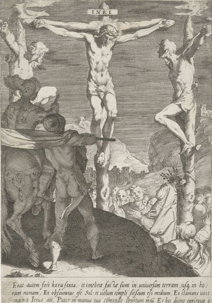 Curator: This intricate engraving by Georg Christian Schule, dated 1786, serves as the title vignette for Smollett's "Peregrine Pickle's Tildragelser," housed here at the SMK. Editor: My immediate impression is of utter chaos—a boisterous and unsettling scene unfolding with theatrical flair, almost nightmarish. Curator: The density of the etching definitely amplifies that sense of turbulence. Schule masterfully used the engraving process to create these densely packed, dramatic scenes. Note the varying line weights to render shadow and texture, adding visual interest to what might otherwise be a simple reproduction. Editor: Exactly, and to what end? I see the story laid bare in the image: a group of men are embroiled in what seems to be a physical altercation, taking place beneath a figure elevated above them. Who are these men and how are they situated socially and politically within this time period? Curator: Without having read the text itself, it is tough to say who everyone represents for sure, but we can ascertain this is figuration set in what would have been the past from the audience perspective in the late 1700s. From a material standpoint, the paper quality and print run would speak volumes about intended audience and affordability of the book. The printing process here facilitated a far wider distribution of storytelling than had ever been possible before. Editor: It's more than just distribution, it's democratization. The artwork gives us visual clues to investigate, for example, is that figure dominating the scene meant to represent someone with privilege oppressing those below? We can discuss ideas around class and the systems of power here. I see that Baroque style lending to this very over-the-top rendering and the artificiality inherent in the depiction of history. Curator: True. The deliberate roughness also suggests speed of production and a market demand eager to absorb visual representations of literature. The availability of printed imagery reshaped public opinion and awareness of cultural narratives. Editor: A narrative still echoing into present social and economic dynamics of inequality! Curator: So, while it initially strikes one as mere bedlam, the careful details reveal a considered work reflecting societal shifts and a move toward new modes of accessing literature through reproduction. Editor: Right, reminding us how art becomes a potent mirror and an agent reflecting and shaping the dialogues of its era—dialogues we continue to have now.