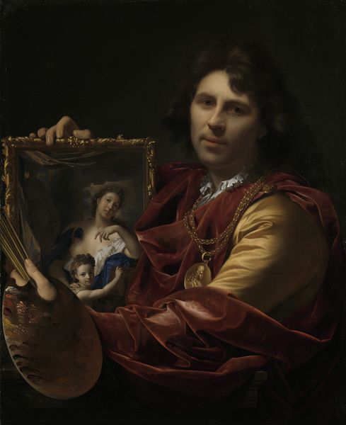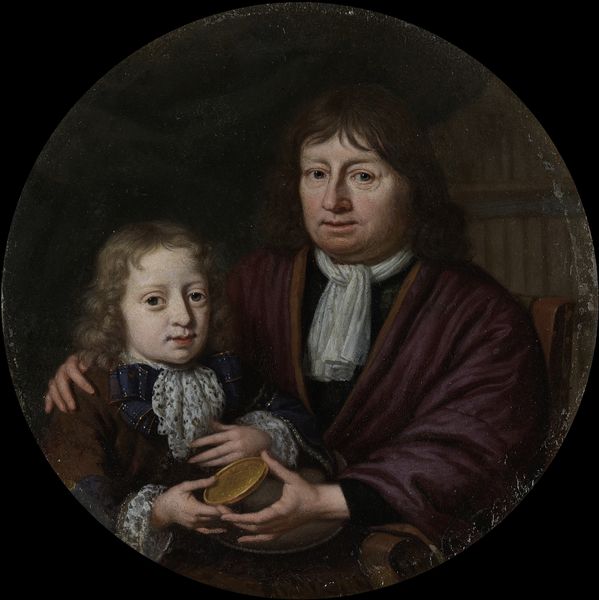 Editor: This rather dark canvas pulls you in close, doesn't it? It feels intimate and perhaps a bit staged. Curator: Indeed. Here we have Arnold Boonen's oil on canvas, created sometime between 1700 and 1729, titled "Jan van de Poll (1668-1745) and his Son Harmen Hendrick (1697-1772)." The painting employs a restricted palette within a somewhat typical Baroque portrait composition. Editor: The materials employed fascinate me. Consider the richness of the impasto in their garments, particularly against the comparatively flattened depiction of the architectural landscape. It seems to highlight the social station secured by the sitters' material wealth, perhaps the fabrics of their attire and the food stuffs in the basket. What do you make of that still life element? Curator: From a semiotic standpoint, one can interpret the grapes and fruit as symbols of wealth and abundance. Boonen cleverly uses this familiar trope to communicate prosperity but, more crucially, as compositional tools leading the eye through a triangle with its peak at the face of the older sitter, grounding it with their hands, creating a relationship and stability that unifies these figures. Editor: I find it more compelling as a display of conspicuous consumption, reflecting the Dutch Golden Age's mercantile society where prosperity underpinned patronage and commissioned work. Boonen seems rather attuned to his patron's worldview; however much he understood pictorial artifice, he understood this deeper. The painting is not so much about an individual, but an institution - a lineage, a place in society. Curator: Precisely. And that sentiment extends into the careful placement of their hands; an offering, a lesson. The interaction is charged with symbolism relating to legacy and inheritance. The muted palette only accentuates these elements and elevates the figures depicted. Editor: I wonder about Boonen's own hand in this. How the economics of art influenced the construction of dynastic images to celebrate family legacy for generations, literally shaping perception of people over time through a painted canvas. Curator: These kinds of painterly manipulations serve an underlying conceptual apparatus, elevating and immortalizing its subject. Editor: It prompts reflections on our own material world and who will chronicle its details. Curator: An astute observation that leaves much for contemporary audiences to contemplate.