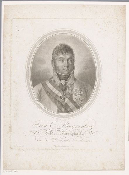 Curator: Ah, an intriguing portrait. This is an engraving dating between 1800 and 1836, titled "Portret van Karl Philip zu Schwarzenberg," by Anton Wachsmann. Editor: Striking! There's something austere yet dignified about it, like a perfectly constructed stage set for a moment of great historical importance. The restricted palette reinforces this controlled atmosphere. Curator: Precisely. Consider how the artist meticulously uses the engraving technique to model the forms. Notice how the delicate hatching creates a remarkable tonal range, suggesting not just the contours of Schwarzenberg’s face, but also the textures of his uniform. It’s a testament to neoclassicism's emphasis on line and form. Editor: And the uniform itself, of course, screams power and status. He was a Feldmarschall, after all. I wonder about the context in which this image would have circulated. Prints like these were instrumental in constructing public figures, crafting a specific image of Schwarzenberg during his military career and beyond. Curator: I agree. The circular framing of the portrait further isolates him, presenting him as an object of admiration, a figure worthy of focused attention and perhaps even emulation. It elevates him, imbuing the image with an almost classical heroism. Editor: Absolutely, and the awards, each one deliberately emphasized, tells its own political narrative, underlining his military accomplishments and the associated influence during the Napoleonic era. This is not just a likeness; it’s a carefully manufactured persona meant for public consumption. It suggests a subtle propaganda in image making. Curator: Indeed. It speaks volumes about how power can be codified into symbols. Through these carefully etched details, a whole epoch is encapsulated. One observes an almost mathematical perfection. Editor: A testament, then, to the intertwined nature of art, politics, and history, each informing the other in this carefully designed image. These images serve as material links to our understanding of figures, empires, and collective identity formation of this era. Curator: A compelling synthesis. A successful rendering for the aesthetic eye while carrying profound contextual meaning. Editor: Yes, precisely why these images still command our attention. It showcases both art and socio-political discourse through lines and symbolic forms.