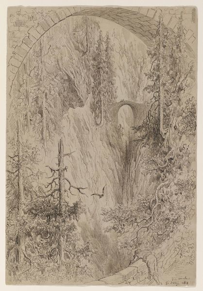 Curator: Here we have Adrianus Johannes Bik’s "Beklimming van de vulkaan Gedé, Priangan, West-Java" created in 1819. It's a graphite drawing currently held at the Rijksmuseum. Editor: My initial reaction is a sense of depth and intricate layering. The graphite work creates a misty, almost dreamlike atmosphere within this very real landscape. Curator: Bik, working within the Romanticism movement, was concerned with accurately documenting the natural world as a means of scientific exploration and also of showcasing colonial exploits. Look at the use of graphite as a readily available material that aligns with field studies of the time. This was more about information gathering than pure aesthetic expression, even though it looks so evocative to our contemporary eyes. Editor: Indeed, but I am struck by how the medium informs the message. The grayscale and fine details lend themselves to the overall composition and play of light and shadow that evoke a distinct mood. Notice how the drawing technique emphasizes the textured bark of the trees, giving volume and realism to them? I find the piece much more visually interesting for how it plays with light and depth in what seems like a monochrome piece. Curator: Right, but let's consider that Bik and other colonial artists contributed to the broader systems of resource extraction. The raw materials present within the landscape were intended to be transformed into commodities to benefit external interests. Editor: From a formal standpoint, you have this dense, almost impenetrable forest presented through the delicacy of graphite. What a wonderful tension that really captures that overwhelming power of nature that artists in this period were concerned with. Curator: Exactly, this type of visual rhetoric promoted ideas about the exotic allure of colonial territories, which justified commercial and other activities there. What looks "beautiful" actually served a pretty exploitative function in society at that time. Editor: That exploitation is invisible when only admiring the formal artistic qualities. Yet understanding this adds another layer to the way we should understand its symbolism and appreciate how landscape representations reflect social and economic power. Curator: Agreed. This piece definitely encourages us to question our perception of the natural world within particular historical and socio-economic structures. Editor: A work where technique meets a dark side of human history.