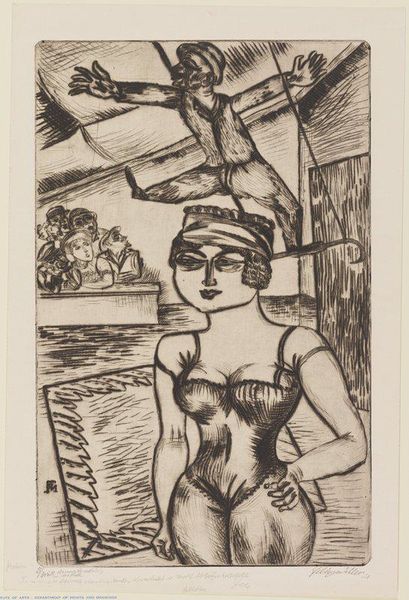 Editor: This is Max Beckmann's "Shooting Gallery." I am intrigued by the stark imagery. What symbols do you see at play here? Curator: The shooting gallery itself becomes a symbol, doesn't it? A target represents aspiration, but also vulnerability. The stylized figure, almost mannequin-like, suggests a detachment, while the gun, obviously, embodies power, agency, and perhaps even aggression. How do these images connect to the artist's own historical context, do you think? Editor: Perhaps reflecting the social unrest of the time? This print certainly offers a lot to consider! Curator: Indeed! It reminds us how artists use symbols to tap into collective anxieties.