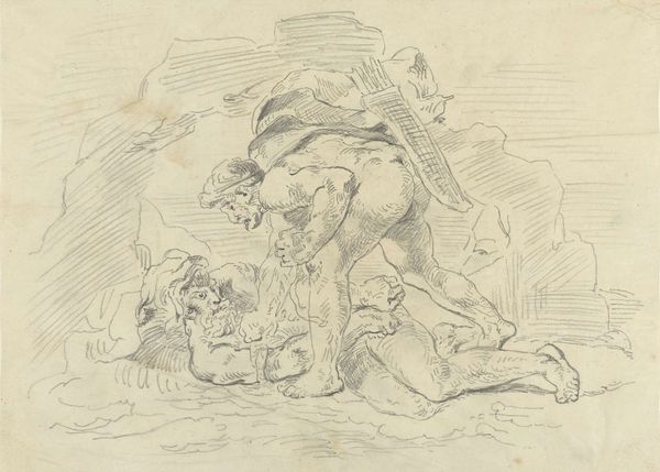 Curator: This delicate sepia drawing, housed here at the Harvard Art Museums, is thought to be Fortunato Duranti’s "The Magdalene at the Sepulchre." Editor: It’s so fluid, almost dreamlike. The wash of brown ink gives it an ethereal, otherworldly feel, but the composition is a bit unclear at first glance. Curator: Well, Duranti was quite invested in conveying emotion through dramatic, exaggerated gestures. Notice how Mary Magdalene’s pose conveys both grief and awe, in the face of the impossible. Consider, too, the institutional role of religious imagery at the time. Editor: True, but look at the materiality, the paper itself, and how Duranti's layered washes build up the figures. There’s an almost tactile quality that contrasts with the scene's miraculous subject matter. It underscores the human element present even within religious narratives. Curator: Interesting point. The artist is grappling with faith through very material means. Editor: Absolutely. It's fascinating how the very act of making art becomes a way of negotiating belief and cultural expectation. Curator: Indeed, and that reminds us of the social power that such images once held. Editor: Seeing this drawing, I think it’s less about dogma and more about Duranti’s exploration of grief, love, and wonder through the labor of his own hands.