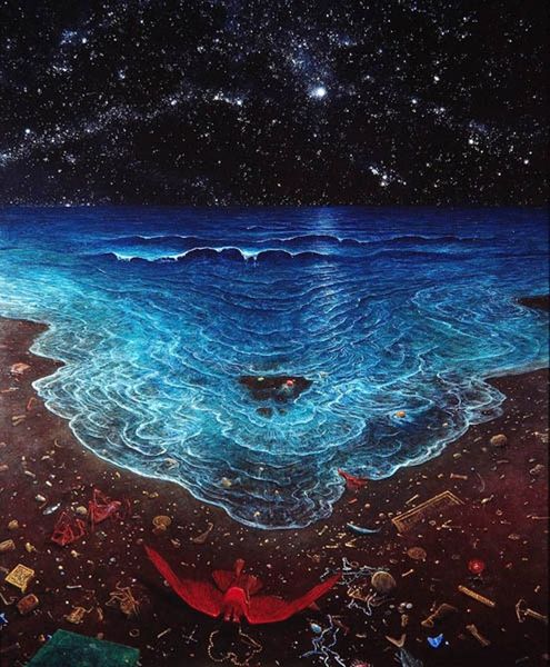 Konstantin Korobov's painting "Sea" invites us to a quiet contemplation of the natural world, made during a period of renewed interest in landscape art. Here, Korobov captures the timeless essence of the sea meeting the shore under a canopy of stars. The neat grid of stars introduces a certain tension. It reminds me of a surveillance technology that threatens to tame nature. The painting evokes a sense of solitude, the artist translates a personal connection to the seascape, perhaps reflecting on broader themes of existence and our place within the cosmos. Korobov’s work bypasses the grand narratives and heroic depictions to offer an introspective view that is both calming and unsettling. What does the sea mean to you? In what ways does nature make you feel both insignificant and deeply connected?