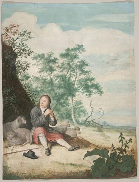 Curator: This is Arthur Devis’ “Portrait of a Gentleman Netting Partridges,” created around 1756 using oil paint. It depicts a man posed rather stiffly in a lush landscape. Editor: It has such a posed, almost performative quality about it, don’t you think? The setting is pastoral, but it also reads like a stage for social identity. Curator: Absolutely. The image contains significant status symbolism of land ownership and control over nature during a period of social unrest in Britain, it serves almost as a form of propaganda. His leisurely pursuit highlights economic privilege in contrast to those experiencing poverty and dispossession at the time. Editor: It certainly does! Observe the meticulous details in his attire, reflecting societal hierarchy and a certain refinement. The netting of partridges becomes a symbol of dominance—of the right to engage with and, in essence, own elements of the natural world, reinforced by the gun resting nearby, which gives it all a sharper edge. Curator: But also consider that Devis, through paintings like this, essentially produced idealized versions of the landed gentry that helped construct and promote social hierarchies and power dynamics. This isn’t just about a man netting birds. It’s about solidifying a social order. Editor: It brings up the layered historical narratives behind representations of leisure and the implications of such a display of ownership and control over the land and wildlife. It reveals so much about that specific period, a visible construction of status and control amidst underlying societal issues. Curator: The backdrop adds another layer; nature as backdrop. It isn’t just a pretty vista, it is actively dominated. Even controlled through art. Editor: I am curious to investigate this scene within art historical themes. Are we really invited to connect it with similar themes like hunting and its link with power going back millennia? Fascinating to see the visual links! Curator: Viewing this, I see a reinforcement of class, gender, and economic privileges that are vital to deconstruct as we interrogate how we represent and reproduce historical narratives even now. Editor: It leaves me wondering about the many facets and historical and visual connotations contained in a single representation of leisure. What it tries to project… and what it ultimately reveals.
