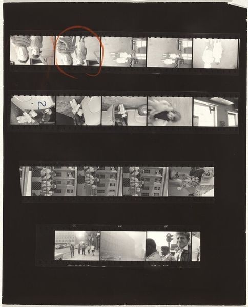 This photographic work titled Congressional 18 by Robert Frank presents a sequence of frames, each capturing fleeting moments within a seemingly ordinary public space. Notice the recurring motif: a bold, red 'X' marked across select images. This symbol, stark against the grayscale, immediately arrests our attention. The 'X,' historically a sign of negation or cancellation, here perhaps indicates choices made, paths not taken, or moments discarded in the artist's creative process. The act of marking, of making a decisive choice to include or exclude, reminds us of similar gestures across history. From ancient scribes crossing out text to contemporary artists defacing or altering existing images, this act of selection carries profound psychological weight. Consider how this simple mark transforms the mundane into something charged with meaning. The act of crossing out becomes a powerful statement, engaging us on a subconscious level. It reveals the artist's hand, a deliberate intervention that emphasizes the subjective nature of seeing and remembering. This symbol, like others before it, continues to resurface, evolve, and take on new meanings in our ever-changing world.