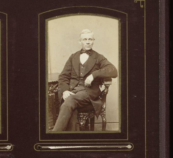 Curator: Welcome. Here we have a photographic print, tentatively dated between 1863 and 1870, entitled "Portret van een staande man met hoge hoed in de hand" attributed to Henri Blanckart. The subject stands in formal attire, holding a top hat. Editor: There's something incredibly melancholic about it, don’t you think? It's like peering into a bygone era, catching a fleeting glimpse of a somber gentleman in his prime. Curator: The tonal range is certainly restricted, lending itself to the perceived melancholia. But the meticulous composition speaks to the prevailing aesthetic concerns of the era. Notice the careful placement of the subject within the frame, the symmetrical backdrop elements, and the stark lighting which all adhere to conventional portraiture practices. Editor: I get that, the pose is stiffly formal—hand tucked in, hat precisely positioned—but his gaze has a faraway quality. And the wallpaper pattern behind him with those recurring rectangular Greek shapes; they feel like endless doors opening and closing, maybe even trapping the sitter inside. Curator: Indeed. One can't overlook how the medium itself—photography—democratized portraiture, and introduced new ways to capture and preserve the human likeness in this realistic depiction. Yet the high contrast flattens the dimensionality, focusing the analysis onto its surface textures, or semiotic arrangement of objects. Editor: It's amazing to imagine people lined up at portrait studios wanting to capture some version of themselves to give as keepsakes. But I see what you mean, its flatness keeps this feeling so…distant from a touch. He feels trapped in two dimensions by choices or societal standards maybe; like an effigy of memory made un-touchable and now kept at a museum in perpetuity. Curator: It offers a valuable lens through which to examine shifting attitudes towards representation, identity, and the very nature of seeing. Editor: And it asks to reflect on your own past and future; all we hope for is to leave something behind that means anything to anyone.