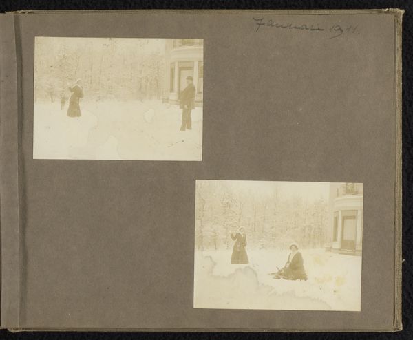 Editor: So, here we have a pair of photographs, "Twee foto's van familie Van den Berg aan het wandelen in de sneeuw tijdens een vakantie in de Alpen," taken sometime between 1930 and 1932 by Frank Willem van den Berg. The silver gelatin prints really capture the quiet of the snowy landscape. The top one gives me a bit of a "Hansel and Gretel" vibe. What stands out to you in these images? Curator: Ah, yes, I get that fairy tale feel too! To me, they are more than just holiday snapshots; they’re little portals into a different time, aren’t they? It's the 1930s! What strikes me is the formal composure within the casual setting of a family trip. The light and shadow create strong tonal contrasts, making almost abstract shapes of the people and trees, don't you think? Are they escaping into the mountains, perhaps a shadow of unease brewing in Europe, seeking solace in nature? Or is it just simply a fun family outing? I mean, look at the fashion of that time... long coats and all, not so practical! What do you think it tells us about photography back then? Editor: That's interesting, I hadn't considered the possibility of deeper social context beyond a simple holiday photo! Perhaps photography was still a bit formal, a deliberate act? Curator: Exactly! Taking a photo was a statement, you see? It was still developing as both art form and personal record. One couldn’t just snap away like we do now! Plus, the aesthetic – the stark contrast, the grainy texture – it evokes a sense of nostalgia even if it's not our personal memory, doesn't it? I think they wanted a memory of a good time as it unfolds. Editor: I see what you mean. I guess even simple photos can be layered with meaning and artistic intention! Curator: Precisely! They make me want to dig out my old photo albums... Who knows what tales lie waiting to be uncovered there? Thank you for sharing your impressions with me!