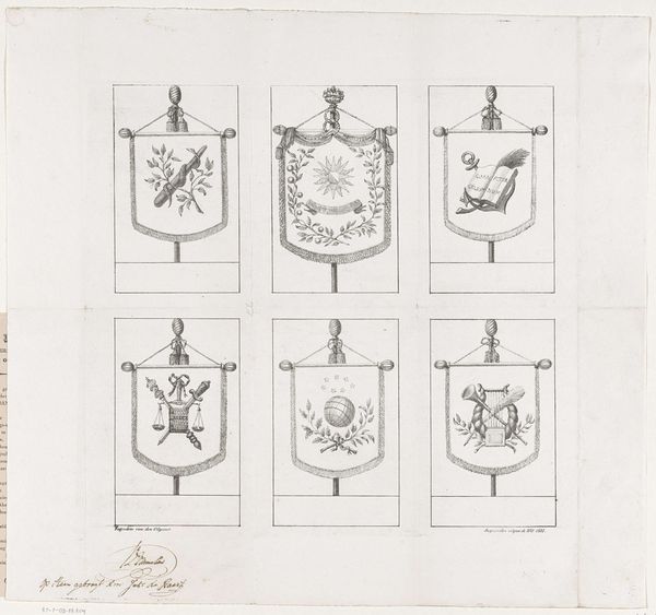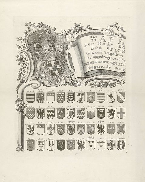 This print, titled "Wapenkaart van oude geslachten van Utrecht," was made by Johannes van Hiltrop, who lived from 1764 to 1814. It's an engraving, a printmaking technique where lines are incised into a metal plate, which is then inked and pressed onto paper. Consider the labor involved in creating such a detailed image. Each line, each heraldic symbol, had to be carefully cut by hand. It's a process demanding precision and skill, a world away from today’s digital printing. The very act of engraving, with its repetitive, meticulous gestures, speaks to a different pace of life, a world where craftsmanship was highly valued. The print is not just an image, it's a record of social status. Each coat of arms represents a family, a lineage, a place in the social hierarchy. In this sense, the work can be seen as a commentary on the social fabric of the time. The value lies not only in the final product, but also in the process of making and its connection to society.