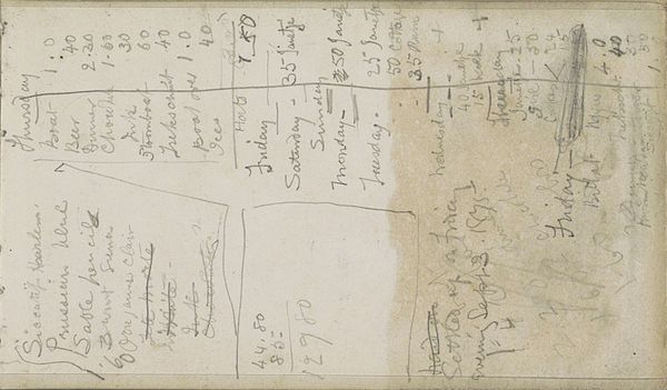 George Clausen’s "Reisnotities" is a simple page torn from what appears to be a travel journal, a mundane list of expenses meticulously jotted down. Yet, these ordinary numbers and notations—prices of beer, lodgings, perhaps sketches of "little girls"—evoke a tradition of record-keeping that stretches back to antiquity. Think of Roman tabulae, recording daily life and transactions, or medieval monastic chronicles. The act of writing itself, of imposing order on the chaos of experience, is a deeply human impulse. In these economic notes, do we find echoes of similar records across time and place? How are similar motifs seen in contemporary grocery lists? These simple lists offer a glimpse into the artist's world, evoking emotional and psychological associations. This humble ledger, so easily overlooked, thus becomes a potent relic—a testament to the enduring human need to capture the fleeting moments of our lives.