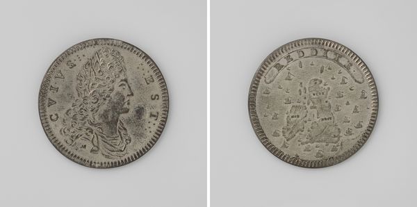 Curator: Here we have a fascinating relief in metal. It’s a piece crafted by Philippe Roëttiers in 1703, titled "Maximiliaan II Emanuel, keurvorst van Beieren, verdediger van de Duitse vrijheid"—Maximilian II Emanuel, Elector of Bavaria, defender of German Liberty. Editor: My first impression is one of constrained power. It's small, yet the ambition of the title suggests something grander, almost propagandistic. Curator: Precisely! It’s crucial to understand Maximilian's role at the time. He was a key player in the War of the Spanish Succession, and this piece serves as a kind of political declaration. Roëttiers was likely working under commission to portray him as a champion. How do you read the symbols here? Editor: Well, immediately the laurel wreath strikes me as a classic symbol of victory and honor, encasing the inscription. The portrait itself is styled in the baroque fashion of powerful leaders at the time, complete with wig and an almost superhuman calmness. This reinforces the image of unwavering authority. But on something the size of a coin almost feels self-aggrandizing to me. Curator: That perceived contrast between scale and claim might just underscore some of the historical contradictions. Maximilian sought to increase his own power through complex alliances; this coin is designed to consolidate his image amidst shifting loyalties and the dynamics of war. Is this an object for Bavarians alone? What impact would it have across enemy lines? How was liberty being framed? Editor: I notice too the careful inscription around the portrait. This text becomes a frame around Maximilian, literally defining him, his territory, and aspirations. It also locks him into that role, both literally and figuratively trapping Maximilian with what's expected of a “defender.” The image would have served to impress a specific social, political and, perhaps even personal circle. Curator: Yes. The metal lends permanence, creating a kind of timeless image. Yet, it's caught in very particular political winds of 1703. That's the central tension, isn't it? Editor: Absolutely. Thinking about this has encouraged me to view objects beyond their aesthetic appeal. It underlines how meaning can be deeply interwoven with historical context, political strategies and a good dose of human ambition. Curator: And how a tiny object can become an ambitious instrument.
