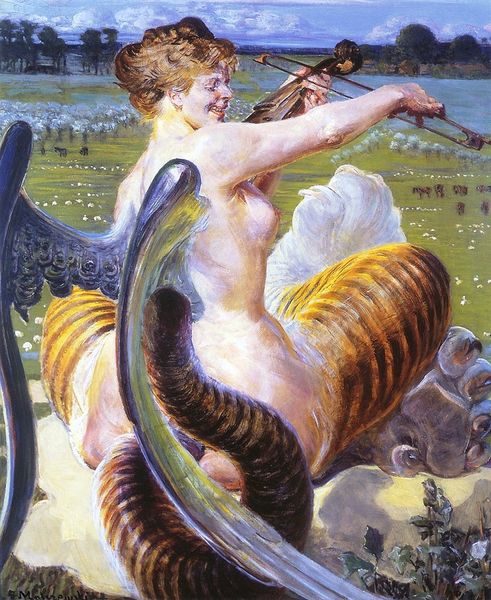 Curator: Welcome. Today, we are looking at Carlos Sablón’s striking oil on canvas from 2016, titled "Sophia." What are your first impressions? Editor: Intriguing. The artist blends elements seamlessly. Butterfly wings, a seahorse tail, it’s all quite captivating. There’s a sense of ethereal realism but those details! What’s going on there? Curator: Sablón often works within the realms of fantasy art and surrealism. The painting invites viewers to reconsider how we perceive and portray female figures in modern art. It seems like the seahorse’s tail implies there is a form of movement depicted here, doesn’t it? Editor: It definitely does. And note the artist’s labor, the precise rendering of each scale and the shell like forms protecting her body, and those iridescent wings – almost insect like but so delicate. You know it takes a lot of care to grind the pigments that finely. Curator: Absolutely. His mastery lies in creating hyperrealistic scenes with otherworldly figures. This piece particularly references classical mermaid imagery while questioning it through this blending of elements from the natural world. It plays into fantasy narratives so prevalent in visual culture. Editor: The seahorse tail as a marker of fantastical nature, yes, but more than that it suggests an alternative use of resources to depict femininity and transformation, I see an echo of labour and even industrial processing in the details of those armored plates which protect Sophia's midsection, that make her seem both vulnerable, with crossed arms, and powerful. Curator: I agree; the shell and scales appear constructed, protective. We can discuss the social contexts of self-image and defense here and, looking at his artistic journey, it appears Sablón has been developing this visual vocabulary over years. He creates this persona through these carefully made material choices, thus, offering an avenue to explore self-presentation within a wider cultural landscape. Editor: Precisely, he merges fantasy, and realism through material illusion to propose fresh takes on familiar figures and stories. Ultimately the question is not why do this figure have those appendages? But, who has made them, how and where? Curator: A perspective which certainly prompts deeper contemplation on the image. Thank you. Editor: My pleasure.