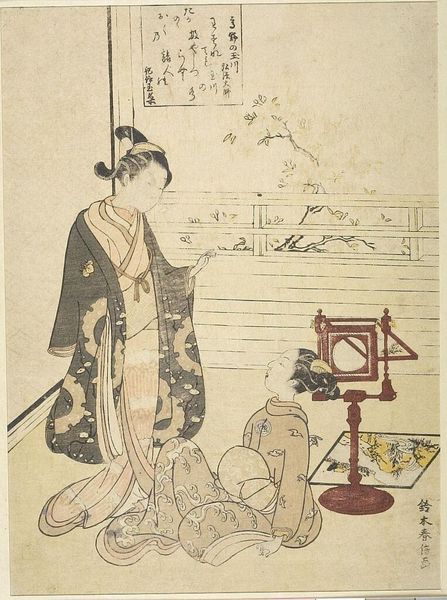 Curator: Shun'ei's woodblock print, "Act Four from the series Treasury of Loyal Retainers," is a fascinating glimpse into Edo-period culture. I see it as visually subdued, almost melancholic, despite the vibrant robes. Editor: Indeed, a pervasive stillness, but the bowing figure draws my eye. What is the social dynamic here? Curator: It depicts a scene from a famous kabuki play, Chushingura, a story of honor and revenge. The kneeling figure shows deference, while the women appear impassive, perhaps resigned. Editor: The stylized gestures are so fascinating and so different to how bodies gesture in the West! The composition is so balanced, but the perspective feels a bit…off? Curator: Woodblock prints often play with perspective for dramatic effect, heightening the emotional impact. The artist is more concerned with conveying the scene's emotional weight. Editor: Shun'ei really captures a pivotal moment, a sense of impending doom hanging in the air. I find its delicate details, like those flowering branches, so poignant. Curator: Exactly. Shun'ei understood how to convey profound narratives through visual economy.
