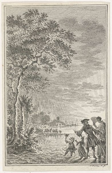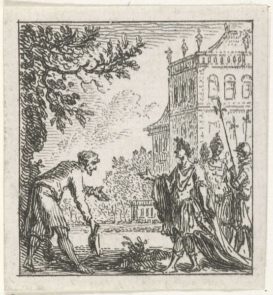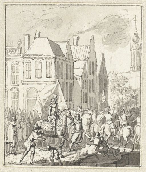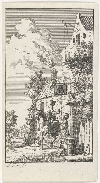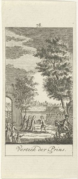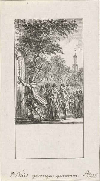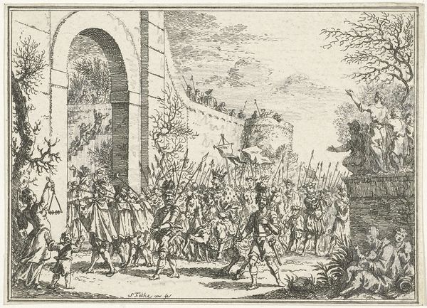 Curator: This is "Schieten naar vaders lijk," which translates to "Shooting at Father's Corpse," an engraving attributed to Simon Fokke, created sometime between 1722 and 1784. Editor: A rather bleak first impression. I'm struck by the stark contrast created through the dense linework. The foreground figure tied to the tree appears almost sculptural against the flatly rendered architecture in the background. It's brutal in its simplicity. Curator: Indeed. The composition guides the eye to the figure tied to the tree, clearly the focal point of the narrative. The execution, employing engraving techniques, showcases incredible precision and control, especially considering the small scale of the work. Look closely at the varied line weights Fokke utilizes. Editor: It also speaks to a culture valuing skill and labor; etching demands focused hours to yield such detail, yet the end product, a print, has reproducibility. What does it say that such an intense investment results in a form easily multiplied and dispersed? Was it a commentary on authority and spectacle for wider audiences, considering what's unfolding? Curator: One could interpret the choice of engraving itself as a means of dissemination, thus widening the audience for the potent imagery. The narrative is directly expressed through the stark depiction, yet is heavily symbolic of a culture and political position, thus encouraging debate on social structures and control. Editor: Let's think about the cost involved too; the plates themselves are reusable, a valuable asset. Who financed this work, and who would buy the end prints? What statements would the buyers like to echo within their social environment? Also, the act of printing allows many social classes access, while limiting who actually views the initial plates with more intrinsic monetary worth. It becomes quite classist. Curator: Precisely, and focusing on formal aspects, the directional lines, perspective, and distribution of figures all converge to intensify the psychological impact of the central scene. The tension between depth and flatness is cleverly constructed to draw our attention precisely to where Fokke desires. Editor: Considering the labor invested in this image meant for wide dispersal and cultural interrogation, it leaves me wondering what statements about craft and society the piece continues to offer centuries after its making. Curator: I agree; a compelling piece, showcasing artistry, social dynamics, and enduring visual impact. Thank you.