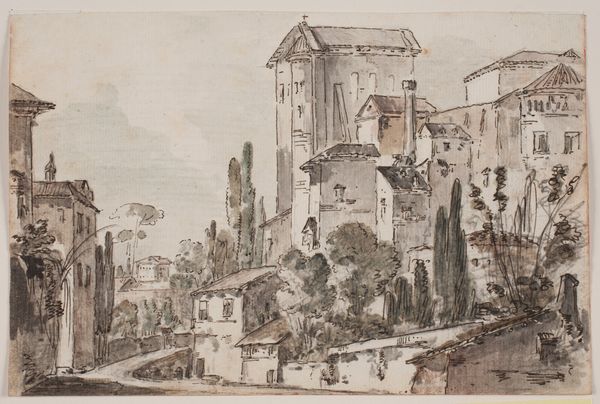 Editor: This watercolour drawing, “Romersk prospekt med mur i forgrunden, kirke og ruin i baggrunden”, or Roman prospect with wall in the foreground, church and ruin in the background by Jens Petersen Lund, made sometime between 1730 and 1790, has an evocative, melancholic atmosphere. What strikes you most about the formal elements in this landscape? Curator: Note the clear tripartite division, an application of structuralism here where the composition breaks neatly into foreground, midground and background. The foreground contains a darkened brick wall, a grounding mechanism against which we have a gradual lightening in the mid and background; one might say it mirrors a journey, from the tangible to the ethereal, each layer carefully considered for spatial recession. Editor: That’s fascinating. It's interesting how the darker foreground guides your eye towards the lighter, almost dreamlike ruins in the distance. The use of line also seems so controlled, especially compared to the amorphous rendering of the sky. Curator: Indeed. Lund's manipulation of linear precision against washes of colour offers an astute contrast. Consider how line dictates structure and permanence versus how the indeterminate wash technique lends an impermanence and transient quality. Ask yourself, how might this speak to an awareness of Romanticism where ruins act as signs pointing to what used to be? Editor: So the contrast emphasizes the decay, the passing of time... it brings a new appreciation for the drawing. Thank you! Curator: Quite welcome. These juxtapositions and oppositions always enhance any given image or idea.