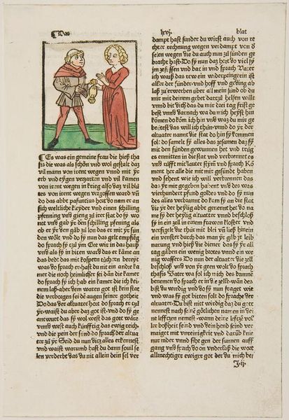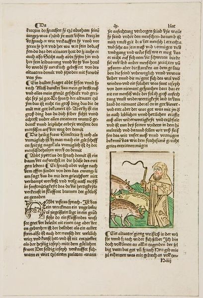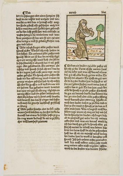 Editor: This woodcut, "Maurus exorcising demons from the workmen," shows what appears to be Saint Maurus performing an exorcism. The image is quite small, and the figures are rendered in a rather simplistic style. What stands out to you about this piece? Curator: I'm drawn to the production and labor involved. Look at the repetitive marks of the woodcut, the almost mechanical process of image creation. It democratizes the image; multiple impressions could be made and consumed. Editor: So, you're saying its value lies not just in the image, but in its accessibility and the means of its creation? Curator: Precisely! It challenges the notion of the unique, precious artwork. It invites us to consider who had access to this image, and how that access shaped their beliefs and understanding. Editor: That’s a completely different lens than I was expecting. I’ll certainly think about art in this way from now on.