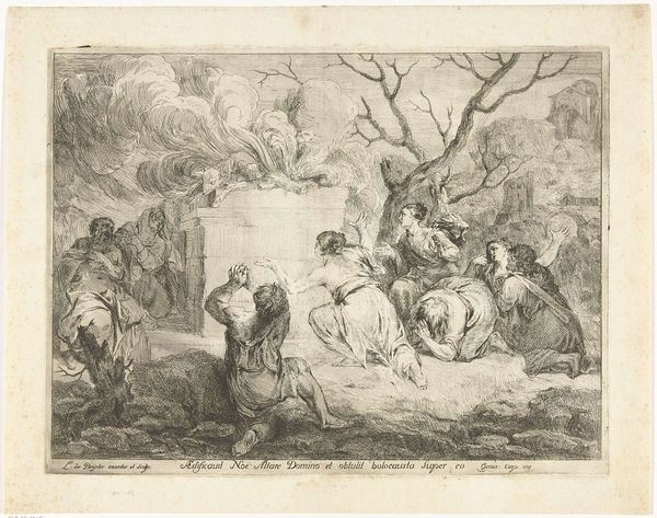 Curator: This etching, attributed to Laurent de La Hyre, is titled "The Holy Family with the Cross, Christ Crushing the Head of the Serpent," and resides here at the Harvard Art Museums. Editor: The eye is immediately drawn to the strong diagonal formed by the cross, creating a dynamic tension within the composition. Curator: Absolutely. The imagery of the Christ Child's triumph over the serpent speaks volumes about power and the subjugation of perceived evil within 17th-century religious frameworks. Editor: And the varying line weights in the etching create depth, guiding the viewer's gaze. The cherubic figures clustered around the cross are also captivating. Curator: Consider, though, the politics embedded: the Church's reinforcement of patriarchal dominance through symbolic renderings of familial structure and divine right. Editor: Perhaps, but the artist’s skillful rendering of texture, especially in the foliage and fabric, is undeniable. I appreciate the formal elements at play. Curator: True, but acknowledging the social implications enriches our understanding. It shows how art both reflects and perpetuates cultural norms. Editor: Indeed. There's so much to admire in the meticulous detail and the artwork’s cultural context.