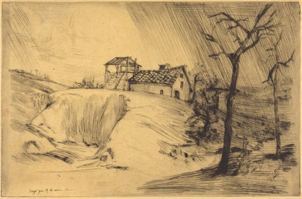 Alphonse Legros created this etching of a farm during a storm, capturing a scene laden with symbolic weight. The turbulent sky, heavy with rain, evokes a sense of impending doom, a motif deeply rooted in human consciousness. Consider the deluge. Across cultures, floods represent cleansing, destruction, and rebirth. Think of the Mesopotamian flood myths or the biblical story of Noah. Such tales tap into a primal fear of nature's power, a collective memory of vulnerability. Yet, they also promise renewal. The storm, then, is not merely a meteorological event but a powerful symbol of transformation. Look at the contrast between the darkened foreground and the distant, faintly lit horizon. This interplay of light and shadow creates a tension, a visual drama that mirrors the emotional turmoil of the scene. It’s a technique reminiscent of the chiaroscuro used by Renaissance masters, like Leonardo da Vinci, to convey depth and emotional intensity. The human psyche, attuned to such contrasts, instinctively reads them as indicators of conflict and resolution. This image is a cyclical return. It’s a reminder that destruction and creation are intertwined, continuously resurfacing in our collective consciousness.