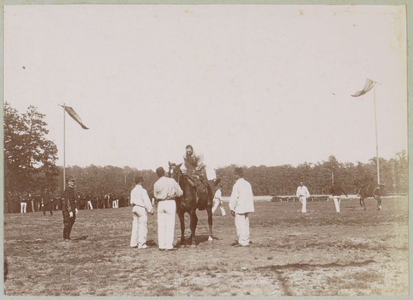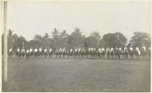 This photograph of a game of horseback ball, was taken in Medan Sumatra, by Heinrich Ernst & Co. The muted tones and subtle contrasts here feel like memory itself. The way the riders are arranged, almost a frieze against the backdrop of palm trees, has a timeless quality that’s really appealing. It’s like the photographer captured not just a moment, but a whole era, the colonial era, maybe. I like how the surface of the print is almost like a soft veil. The details aren’t super sharp, which makes the scene feel more dreamlike. There's something about the vastness of the field, and the smallness of the figures, that emphasizes the staged nature of the scene. What is that giant ball? I see a tension between the formal composition and the everyday activity it depicts. It reminds me a little of Edwardian photography, but with a distinctly colonial twist. It’s a quiet image, and invites reflection on what it means to observe a culture from the outside.