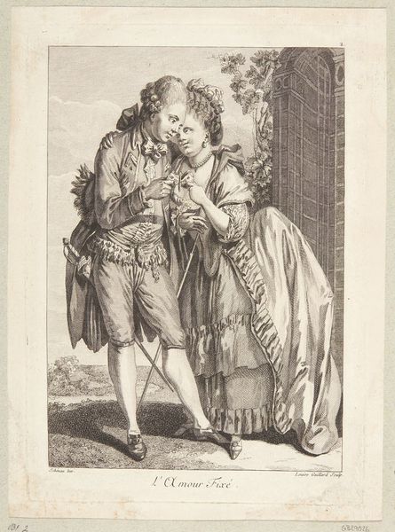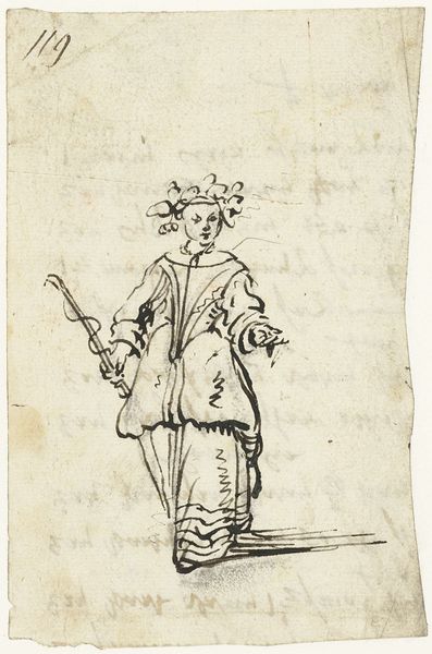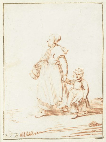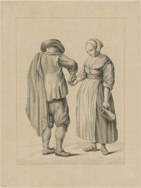 Curator: Looking at this delicate drawing by Jacques Callot, "A Cavalier with his Lady," created with pen and India ink, one is immediately struck by the intricate detail despite its modest scale. Editor: Indeed! My first impression is one of understated elegance; the etching technique feels remarkably precise. You almost imagine the clothing swishing with them! What can you tell us about this context? Curator: Callot lived from 1592 to 1635, and he worked extensively with printmaking techniques that were becoming quite popular at the time. This piece, showcasing a fashionably dressed couple, exemplifies how dress functioned as a symbol of social status and aspiration within the context of the baroque era. These figures weren't simply wearing clothes; they were performing a specific role in society. Editor: And if we consider the means of its creation, that etching—that method of production itself—contributes to this performance, does it not? The etching process and then the dissemination of images. We see how reproductive technologies shape art and society simultaneously, with craftsmanship made available to a wider audience through prints, though with limited viewership at the time! The drawing then is one aspect of its journey, material and cultural. Curator: Precisely. Callot used innovative etching techniques to create finer lines, leading to a level of detail previously unseen, thereby democratizing the image-making of elites, even though it's still for the privileged. How do you think such detailed observation of costume would affect the viewership? Editor: For the burgeoning middle classes especially, the availability of such detailed depictions would reinforce existing social structures whilst, for those outside, these might act to provoke or incite different views of court and class, even subversion! The image functions within complex webs of institutional power, reinforcing hierarchies of the day, but does this, always? Curator: That is a powerful reminder of the complexities involved in our observation. Studying "A Cavalier with his Lady" pushes us to remember not only how artwork is made but the societies they live in, from production to consumption. Editor: Callot’s drawing really is a testament to the interplay of socio-historical context, skill, and our ability to extract narratives from lines drawn centuries ago!