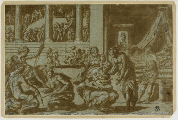 Marcantonio Raimondi created this engraving, "Martha leading Mary Magdalene...," in the early 16th century, during the height of the Italian Renaissance. The print depicts a biblical scene, yet its composition and style reflect the artistic and intellectual values of its time. Martha guides Mary Magdalene up the temple steps towards Christ. The narrative subtly challenges conventional roles: Martha, traditionally seen as the domestic figure, takes on a leadership position, guiding her sister toward spiritual enlightenment. Mary Magdalene, often portrayed as a repentant sinner, is here presented as a figure of potential transformation. The setting, reminiscent of classical architecture, situates the Christian narrative within a broader cultural context, intertwining religious and humanist ideals. Raimondi's work invites us to consider the complexities of faith, gender, and redemption. The image gently pushes at the boundaries of traditional representation.