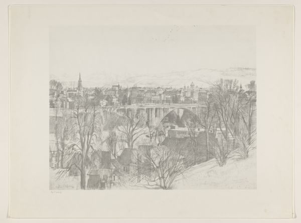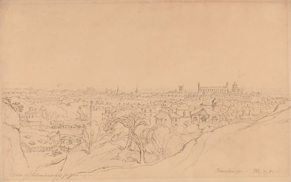 Curator: At the Städel Museum we find a drawing attributed to Johann Heinrich Hasselhorst titled "Ponte zwischen Ariccia und Albano mit Palazzo Chigi." The artwork appears to be rendered in pencil and possibly ink, capturing a landscape scene. What are your initial impressions? Editor: Immediately, I notice the muted tones and delicate line work; it evokes a feeling of quiet contemplation, a subtle almost ephemeral quality. The entire composition is built up by these gentle gradations and seems almost dreamlike. Curator: Precisely. Hasselhorst masterfully utilizes hatching and cross-hatching to delineate forms and create a sense of depth. Notice how the architectural elements of the Palazzo and bridge are precisely rendered, contrasting with the more loosely sketched foreground of trees and figures. It plays with oppositions; architectural grandeur and pastoral simplicity. Editor: I'm curious about the making of this piece and its implied labor. The softness suggests pencil primarily, but the sharper definition may have been added later by the more resilient ink, potentially used to articulate detail in stages across production? I think understanding this layered technique also deepens our reading of intention. Curator: An interesting point. The very deliberate process in crafting the image also echoes broader social currents; the era of meticulous observation and documentation that influenced landscape aesthetics and fostered precise draughtsmanship as an appreciated skillset. The materiality here is the message itself, mirroring the labor imbued within this artful sketch. Editor: Perhaps. To that end, examining this artwork through its constituent elements – pencil, ink, and paper – illuminates both artisanal approach as well as intended context through subject, like a bridge meant for people. The hand of Hasselhorst shows us both form and content are not separable. Curator: A most astute observation indeed. Hasselhorst, through this understated work, creates a compelling dialogue between nature and man, artifact and scenery, leaving us contemplating their relation through both material and ethereal properties. Editor: Yes, an artistic artifact reminding us that art’s capacity rests upon skillful combination, offering material and symbolic understanding for those keen to delve beneath its calm façade.