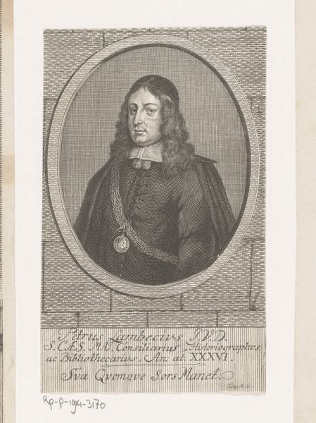 Curator: Here we have "Portret van Adriaan Wesel," an engraving created in 1686, depicting the titular figure, Adriaan Wesel. Editor: My initial response is one of slightly unsettling calm. The grey monochrome and somewhat stern countenance give an air of severity and religious fervor; quite standard in its presentation. Curator: Indeed. Observe how the artist uses line and shadow to create a sense of depth and texture. The subject's gaze is direct, commanding attention, framed in an oval border along with various calligraphic inscriptions that underscore this construction of austere virtue and elevated intellect. The play of light enhances the dimensionality, accentuating his features with great attention to structure. Editor: Certainly. The subject's placement, and the very deliberate inscriptions do convey authority, don’t they? Given the Dutch Golden Age context, one can easily read this image as not only religious devotion but also as a assertion of cultural and intellectual authority as Amsterdam rose as a major center for commerce, trade, and even intellectual debate. Curator: The Baroque influence is evident in the composition's drama, and in the elaborate details, even within the controlled medium of engraving, don't you agree? Editor: Without question, although the historical moment—following the end of the Eighty Years' War—offers yet another perspective: a desire to project Dutch might through these formal conventions which may be perceived as quite subtle in its deployment. This representation almost becomes a symbol of societal and cultural ambitions tied into this clergyman’s influence. Curator: Yes, I see that, the piece has this powerful synthesis of artistry and historical relevance. Editor: Right, and recognizing that intertwining makes the artwork significantly more potent. Curator: So true, understanding the art becomes this exploration of both the beauty within, and it's echoes across the corridors of history!