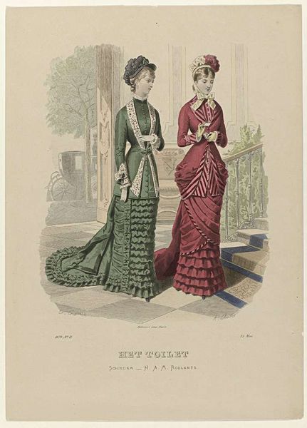 E. Cheffer created this print called, "Het Toilet, 15 april 1879, No. 10." It’s fascinating to consider how fashion plates like this one, produced in the Netherlands, reflect the values and aspirations of a society. The print depicts two women in elaborate dresses, showcasing the height of late 19th-century bourgeois fashion. Their attire signals a particular social status, one afforded by economic prosperity. The scene, set indoors, suggests a world of leisure and domesticity, quite separate from the industrial labor that supported the Dutch economy. What’s striking is how these images promoted a certain ideal of womanhood. A woman whose primary role was to embody wealth and refinement. These prints weren't simply about clothing; they were about constructing and reinforcing social norms. To fully understand this image, we need to delve into the history of fashion, the rise of consumer culture, and the evolving role of women in Dutch society. Archival sources, fashion magazines, and social histories can offer rich insights into the world this print represents.