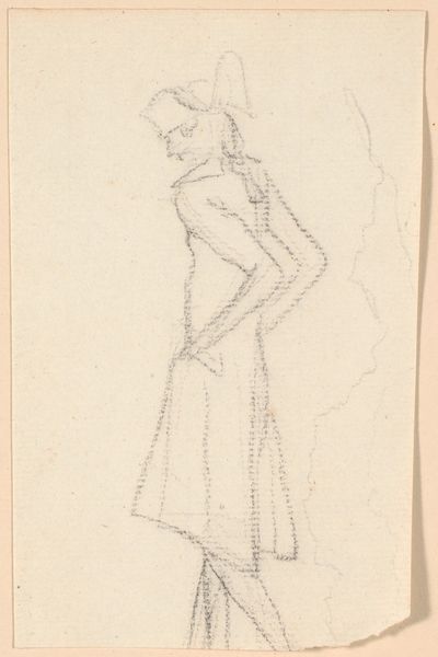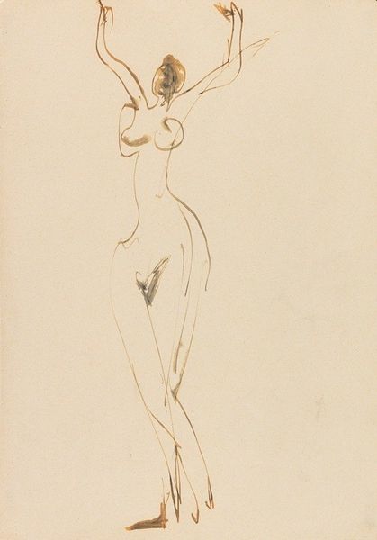 Curator: Immediately, there's something delightfully sardonic about this image. Like a private joke being whispered just beyond my earshot. Editor: Today, we are looking at a drawing from 1893 by Henri de Toulouse-Lautrec titled "Yvette Guilbert." Curator: Ah, yes, a study of the performer. It's minimal but captures so much! Look at how a few confident strokes define the angle of her nose and the upward tilt of her chin, suggesting both vanity and amusement. The blue shading on her dress provides dimensionality. Editor: Exactly. Note how the stark black of the gloves creates a dramatic tension with the paper’s tawny background. Their linearity contrasts nicely with the softer, more suggestive lines defining her face and body. We observe a fascinating interplay of forms. Curator: She's flaunting, yet world-weary; an actress who's seen it all, almost like a knowing glance in your direction. And the posture! So theatrical, but restrained. The upturned gesture of the glove almost parodies the high-society elite. Editor: The gloves really dominate—extending, assertive dark forms on the pale canvas—becoming both elegant adornment and semiotic marker of her performance identity. Are they armor, tools, or simply fashionable concealment? It feels intentionally ambiguous. Curator: The more I look, the more that minimal application of pigment serves the portrait. Each deliberate choice, line, shadow—it communicates beyond a mere rendering. I think, even, we are dealing here with proto-cinematic ideas: pose, light, motion all arrested on a two-dimensional picture plane. Editor: A bold assertion but convincingly observed in its form and content. One can’t help but acknowledge that Lautrec’s work here transcends a straightforward likeness, moving towards some raw statement about performance, persona, and public gaze in the nascent age of modern celebrity. I, for one, find that remarkable in such a subtle impression. Curator: A testament to both subject and artist. What remains unspoken, often reverberates more intensely than a loudly declared statement. Editor: Indeed. There’s an honesty present within the deliberate imperfection that echoes beyond her age, or ours.