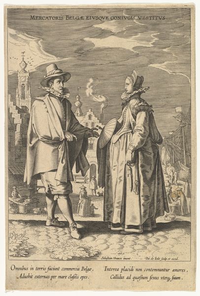 Pieter de Jode I made this engraving, *Nobilium in Belgio Utriusque Sexus Ornatus*, sometime around the turn of the 17th century. The title translates roughly to “Nobles of Both Sexes in Belgian Clothing.” It's fascinating to consider the labor involved in creating prints like this. Each line you see was carefully incised into a copper plate, a painstaking process demanding immense skill. The image would then have been printed onto paper. Here, the material and method elevate clothing into a status symbol, quite literally etched in history. The weight of the garments worn by this couple is palpable; the folds and textures meticulously rendered through de Jode’s mastery. The work prompts us to consider the social context of fashion and the amount of work involved in the production process. It also forces us to see the image as an early form of documentation. Ultimately, this print is a testament to both de Jode’s artistry, and the skilled labor required to produce an exquisite piece of cultural record.
