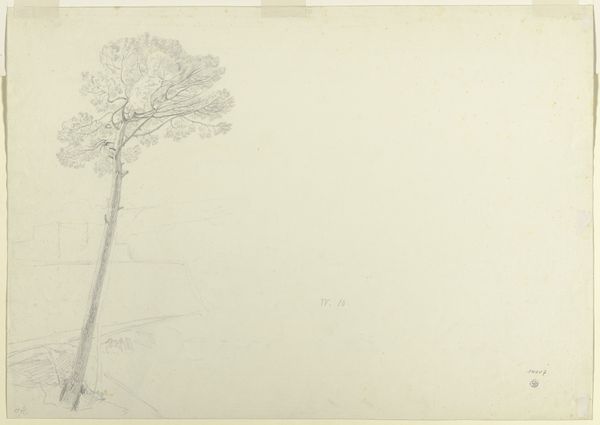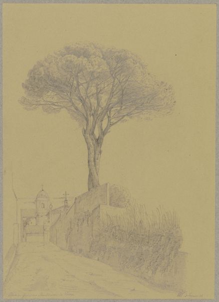 Curator: What a delicate drawing. It seems almost whispered onto the page. Editor: It certainly possesses a quiet, almost melancholic stillness. Is this one of Bamberger's landscapes? Curator: Indeed. We're looking at "Baum bei einem Haus in Peschiera del Garda" – "Tree by a House in Peschiera del Garda," rendered with pencil on paper sometime between 1851 and 1856. Bamberger captured this scene in northern Italy. Editor: The tree itself dominates the composition. Its imposing presence, the texture so meticulously created through layered pencil strokes... it reads almost as a symbol of endurance, perhaps even resistance against the more settled structure of the house behind it. Curator: An intriguing thought! Think about the burgeoning German nationalism during Bamberger’s lifetime, particularly after the failed 1848 revolutions. Trees, especially oaks, became potent symbols of German identity and strength. Although this is Italian landscape, are we really seeing a reflection of a German sentiment projected onto an Italian scene? The lone tree could signify resilience and a yearning for stability in a time of political upheaval. Editor: That opens it up to new interpretations, certainly. The house then…what does it represent in opposition to the tree? A constraint? Societal expectations of enclosure and safety perhaps? Is this perhaps representative of tensions and expectations within the patriarchy of mid-19th century Europe? The scale of the house is diminutized relative to the outsized tree and evokes this imbalance for me. Curator: The details are truly evocative here, right? From a distance, the crown of the tree appears to be illuminated. But upon a closer inspection, the shadow marks a solemn, still scene. I am intrigued to keep following those intricate layers and its implied emotions that challenge an assumed idyllic natural world. Editor: And I appreciate the invitation to reimagine established German symbols, expanding the image beyond a picturesque scene into the sphere of national and societal consciousness. Curator: A fresh consideration indeed. Thanks!
