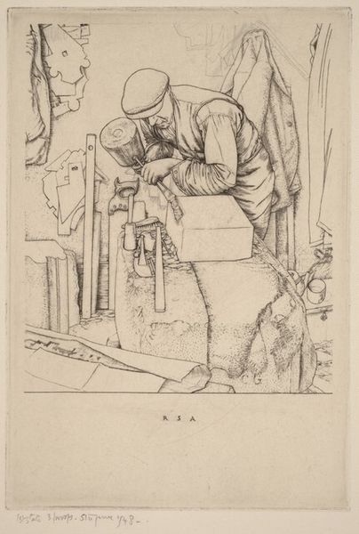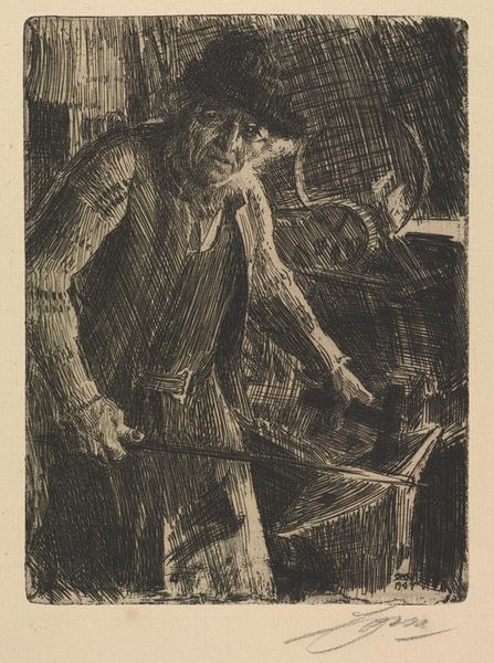 Jozef Israëls created this etching, titled 'Nettenboetster', in the Netherlands. The central figure is a woman mending nets. The act of mending, of repairing what is broken, carries deep symbolic weight. Consider Penelope in Homer's Odyssey, weaving and unweaving a shroud, a symbol of both hope and despair, of waiting and resistance. Here, the woman's bowed head and focused attention evoke a similar sense of dedication, but also of weariness. The net itself, a tool of the sea, represents both sustenance and the ever-present threat of the waters. This image resonates with earlier depictions of labor and domesticity, yet it also anticipates the stark realism of later works focusing on the lives of ordinary people. There’s a profound psychological element at play – we are drawn to this image not just by what we see, but by what we feel: a deep connection to the enduring human struggle for survival and meaning. The repairing of nets becomes a powerful symbol, transcending its immediate context.