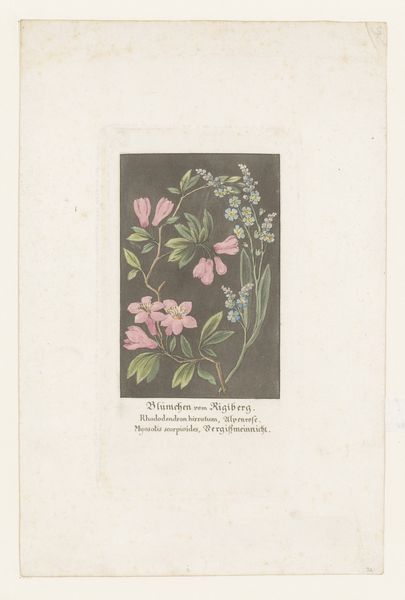 Curator: The Minneapolis Institute of Art holds this rather enchanting floral print. It's titled "Flower Print No. 32" by John Edwards, dating from 1784 to 1788. It seems to be rendered with watercolor on paper. Editor: It gives the impression of being contained, somehow—delicate, yes, but with this rather severe oval framing and a reserved palette. It’s quite a curious arrangement; something both appealing and slightly melancholic in its presentation. Curator: Melancholy may stem from an understanding of the context. Consider the era: botanical illustration flourished alongside increasing colonial exploitation of global resources. Flowers, especially exotic ones, become symbols of wealth and imperial ambition, stripped from their origins and recontextualized as trophies. Editor: A strong reading! But one could also read it as a study in contrasts, structurally speaking. The delicate blooms versus the bristly, thorny stems, the vibrant, saturated ribbon at the bottom. The artist really commands attention to the specific juxtaposition between these things. Curator: Precisely, and look how the very act of tying the ribbon around the stems almost suggests a binding, a forced constraint—a visual echo of colonial power dynamics, perhaps even a critique of the practice of categorizing and displaying nature like a possession. Editor: I find the rendering to be interesting, a sort of controlled abandon. The coloring is both precise and muted, with very little variation across the different surfaces. Even the leaves have an almost metallic quality, giving the overall scene a slightly detached feel. Almost clinical. Curator: Absolutely, there's a tension between scientific observation and aesthetic representation here. The artist attempts to capture the true form, but through the lens of a social system eager to claim and contain nature's bounty. It encourages reflection on humanity's relationship with nature during a period of significant global upheaval and botanical obsession. Editor: I'm persuaded! It's true that beneath its lovely exterior lies much for us to explore regarding both artistic composition, and its possible embedded socio-historic meanings. Curator: Indeed, seeing beyond simple representation to discover layers of interpretation. It invites questions regarding colonial influence, class and displays of wealth.