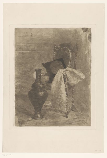 Felicien Rops created this print, *Keuken van een herberg in Anseremme*, using etching, a process that democratized image-making in the 19th century. A metal plate is coated in wax, the artist scratches an image into the wax, and then the plate is bathed in acid, which bites into the exposed metal, leaving an impression that can be inked and printed. Rops was fascinated by the ways of making, and the means of production in which objects and artworks are created. The texture of the lines, the depth of the shadows – all are directly related to his engagement with the etched plate. What’s interesting here is how Rops uses a medium capable of infinite reproduction to depict a scene of humble labor. Look at the woman, presumably a worker at the inn, caught in a moment of domestic activity. The print, in its inherent reproducibility, contrasts with the singular, manual labor of the woman in the image. Consider how Rops’ choice of etching emphasizes the social and economic realities of his time, nodding to mass production while depicting everyday life.