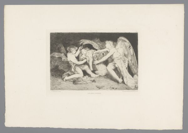 Waldemar Bøhme created this illustration for a fairytale using engraving, a technique that dates back to the 15th century. Bøhme lived during a time of burgeoning nationalism and a renewed interest in folklore. The image presents a sleeping giant, vulnerable and still, while two smaller figures flee in the background, one seemingly in distress. During the late 1800s, visual representations of folklore were often deployed to create a sense of national identity, emphasizing the values, traditions, and stories that were considered unique to a particular culture. The sleeping giant could be interpreted as a representation of the old ways, or the old world, being overtaken by the new. Consider the power dynamics at play here: a giant, typically seen as powerful, is rendered helpless, while the smaller, human figures gain agency through their escape. The image evokes the emotional tension between fear and freedom, oppression and liberation, inviting us to reflect on who holds power and how it can shift.