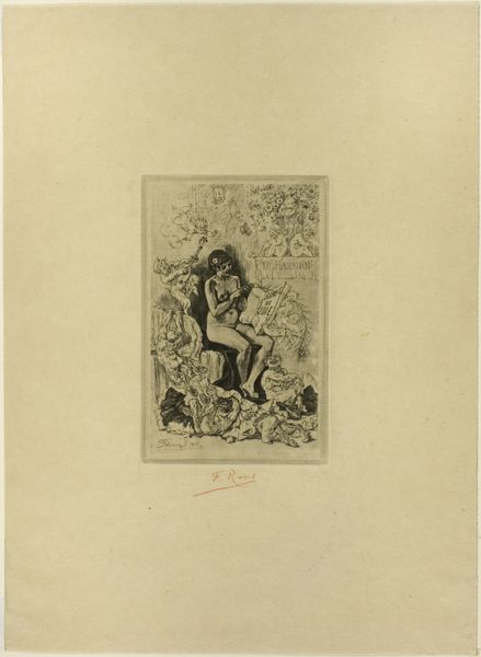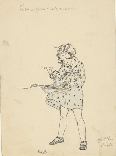 Curator: This delicate image is titled "Journal des Dames et des Modes, Costumes Parisiens, 1914, No. 140 : Un lutin," which translates to "A Goblin" in English. Executed in pen and ink, this piece embodies the Art Nouveau style, rendered by the artist identified only as Monogrammist MFN. Editor: It feels like a child's daydream. Simplistic lines form a figure dressed as a pixie, a sort of fashionable sprite standing in a field of miniature flowers, with a rabbit looking up at her. It has a naive quality that's instantly charming. Curator: What strikes me is the context. "Journal des Dames et des Modes" was a real publication showcasing Parisian fashion. To present a goblin-like figure reveals an intriguing commentary on the whims and fancies of the upper class, and the fashionable costume balls that marked high society at the time. It reflects a desire to escape into fantasy. Editor: Precisely. The symbolism of goblins, even "cute" ones, leans into trickery, mischief. Are we to understand that fashion itself can be a sort of enchanting deception, a playful manipulation of appearances? Even the flowers decorating her person and in the ground where she stands suggests an Eden-like scene—but also, perhaps, a more precarious, temporal state. Curator: Perhaps. Though I am keen to also consider the social moment it appeared—almost at the brink of WWI. Images like these created a counterpoint of light-heartedness in a society bound to face unprecedented hardship, where nostalgia itself turned into escapism. Editor: An interesting counterpoint. Certainly the presence of the rabbit could signal innocence and vulnerability—but also speed, agility, even heightened sensory awareness of lurking danger! Curator: Ultimately, whether whimsical, a darker fantasy or indeed just a symbol for escape, it certainly encapsulated a moment of immense change on the brink, didn't it? Editor: Indeed! And regardless, a visual testament to the idea that even fashion could delve into the realms of the fantastic and allegorical.