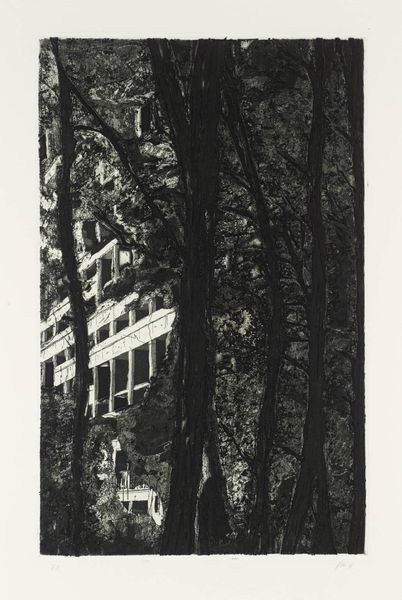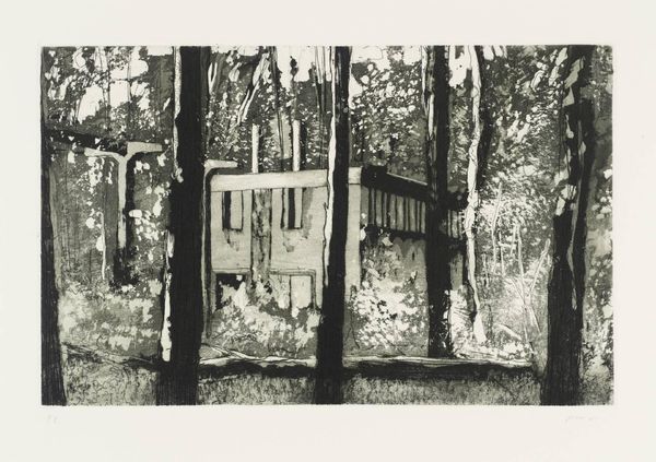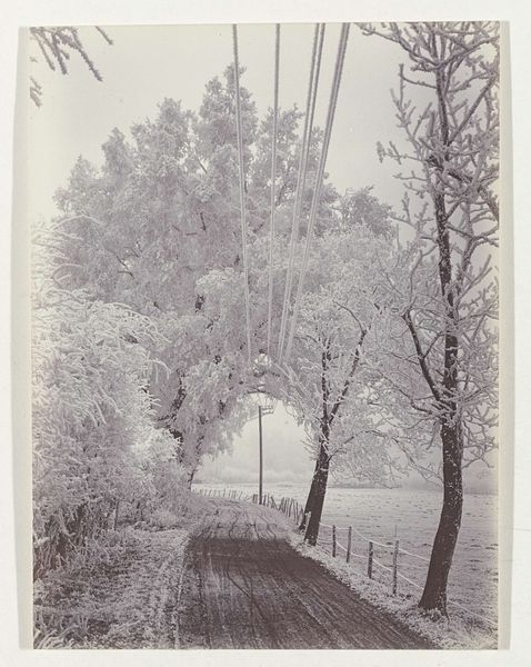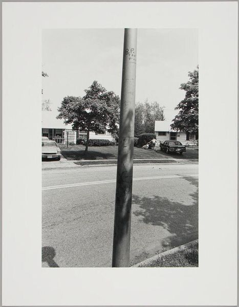 Editor: This is Eric Baden's photograph, "Sag Harbor, L. I." It's a black and white image, and the composition feels very fragmented, almost like a screen. What do you see in this piece? Curator: It's a compelling image, particularly through the lens of environmental activism. Sag Harbor, like many coastal communities, is grappling with climate change. The photograph captures a tension: the natural elements – the trees, the light – juxtaposed with the stark reality of infrastructure and perhaps even construction. Editor: The power lines are really prominent! Curator: Exactly! They symbolize our dependence on systems that contribute to environmental degradation. Baden subtly hints at this struggle, inviting us to contemplate our role within this landscape. Editor: I never would have looked at it that way! Curator: It's about connecting the dots, seeing art as a reflection of our times, and a call for change. Editor: I'll remember to look for those connections in the future. Thanks.