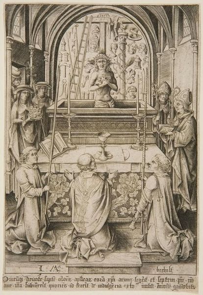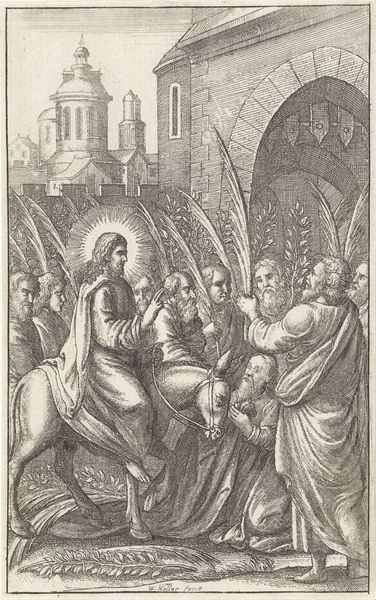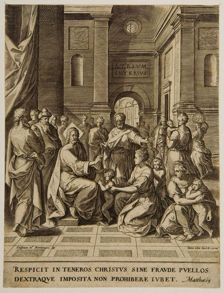 Editor: This is Matthäus Merian the Elder’s "Christ and the Adultress." It’s an engraving, and I'm struck by the contrast between the ornate architecture and the figures consumed by shame and judgment. What do you see in this piece? Curator: I see a powerful commentary on the social dynamics of religious authority in the 17th century. Note how Merian positions Christ, seemingly diminished, writing on the ground. He's challenging the performative piety of the accusers. What does that positioning suggest about the role of public judgment versus private reflection? Editor: That’s a good point! It feels like he's undermining the power of the crowd and emphasizing personal responsibility. It makes me reconsider the whole scene. Curator: Exactly. Merian invites us to question the social structures that perpetuate such spectacles. This wasn't just a biblical scene; it was a mirror to his own society. Editor: Thanks, I see it differently now. It's more than just a religious story; it's a critique of power.