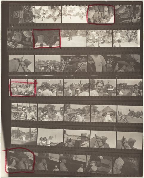 Robert Frank made this intriguing contact sheet, "Hollywood 29," using gelatin silver print, it’s a peek into his photographic process. It’s all about the marks: the intense, dark blacks of the film strips against the brighter, greyish images. The photographs themselves show people, but they’re also layered with Frank’s edits, with the bold red and blue marker circling different sections. These aren't just photographs; they're records of looking and deciding. The marks feel spontaneous, like quick thoughts made visible, and in a way that's what art should be! Look at the frames outlined in red. What drew Frank’s attention there? The process is a story of its own, one of selection and maybe even rejection, which is just as much part of the art as the final print. Like John Baldessari said, sometimes the most interesting thing is what you leave out.