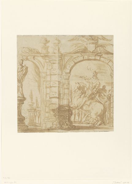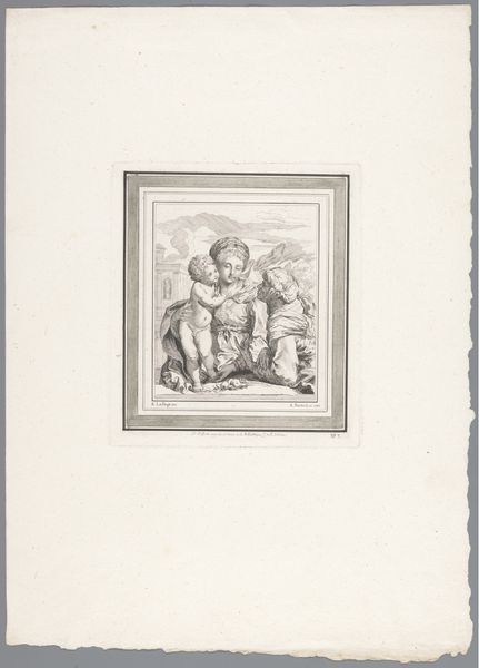 Curator: Looking at this drawing, I’m immediately struck by the vulnerable softness achieved in the rendering of the figures despite the use of sanguine. It evokes a tenderness that contrasts the classical subject. Editor: Indeed. What we have here is “Study for the Triumph of Divine Love with Amor,” attributed to Peter Paul Rubens and estimated to have been created sometime between 1587 and 1640. It's currently held in the Rijksmuseum. It is a detailed drawing using dry media on paper. Curator: Right, the triumphal motif is strong. The symbolism of Amor atop the lion immediately brings forth images of the cyclical relationships of control and desire throughout history. I imagine Rubens thought carefully about what this coupling would project. Editor: Absolutely. Lions are often associated with strength, kingship, and even divinity in numerous cultures. In this image, we also see an association to the early Christian church because Mark the Evangelist is traditionally associated with a winged lion. Here it is led by Amor, suggesting divine influence tempering earthly power. Curator: That interpretation opens up new ways to explore how notions of power intertwine with theological arguments. This almost tames that power, in a way… But perhaps more powerfully suggests a particular control over certain communities. Editor: Consider the emotional resonance these symbols held in the 17th century. It served not just as visual communication but was understood within existing socio-cultural beliefs that are sometimes at odds with the messages in the drawing. This image, thus, also works as a tool to examine past values. Curator: This work serves to prompt considerations around faith, power, and, to a degree, what liberation might look like. These layered dialogues of past, present, and the spaces in between are essential to navigating any cultural heritage collection. Editor: Seeing this sanguine study, my focus lingers on these powerful and malleable symbols, as I reflect upon their evolving meanings.